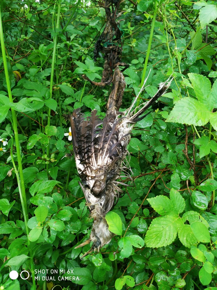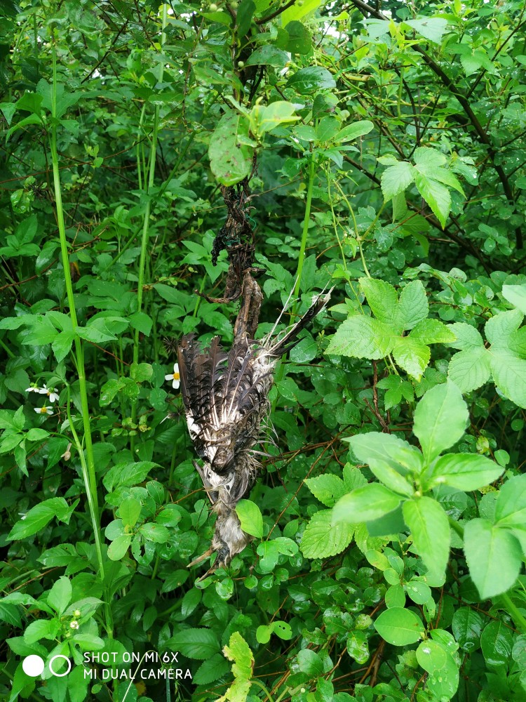 一只花哥鸟被垃圾缠住脚吊死树枝上,哎!
