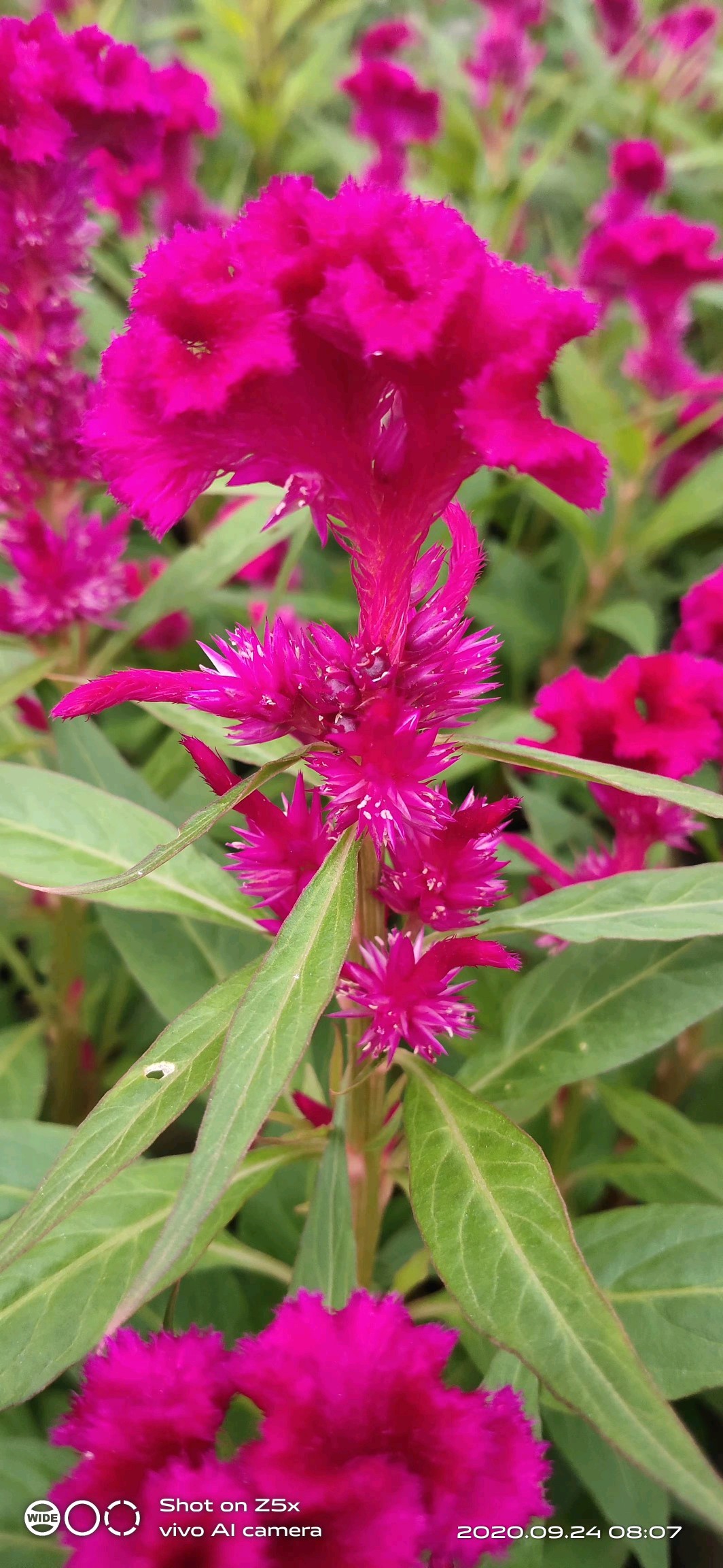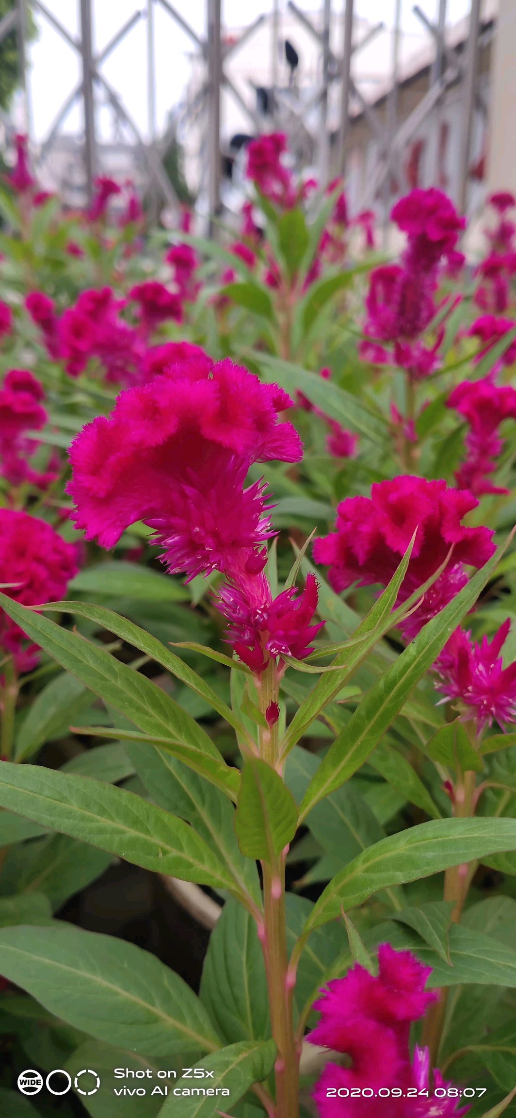 厂大门前的鸡冠花开红似火