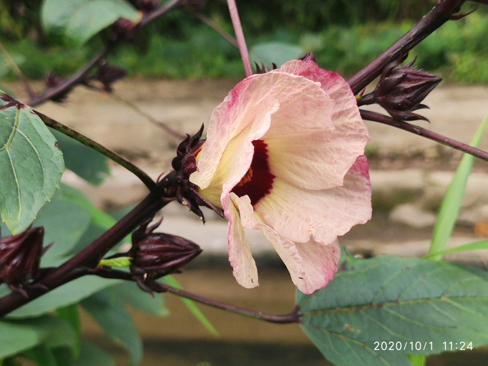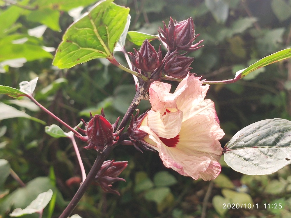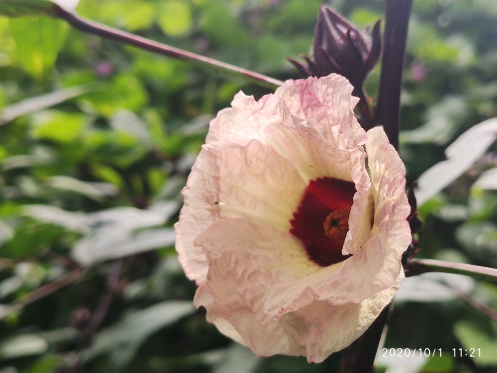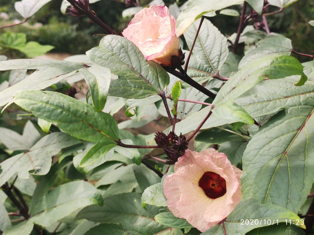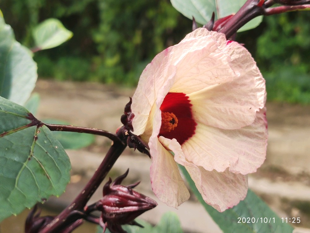 知道它开花了,心里便总惦记着它。隔三差五的总要特意拐到有它的路上,这不又来看玫瑰茄了