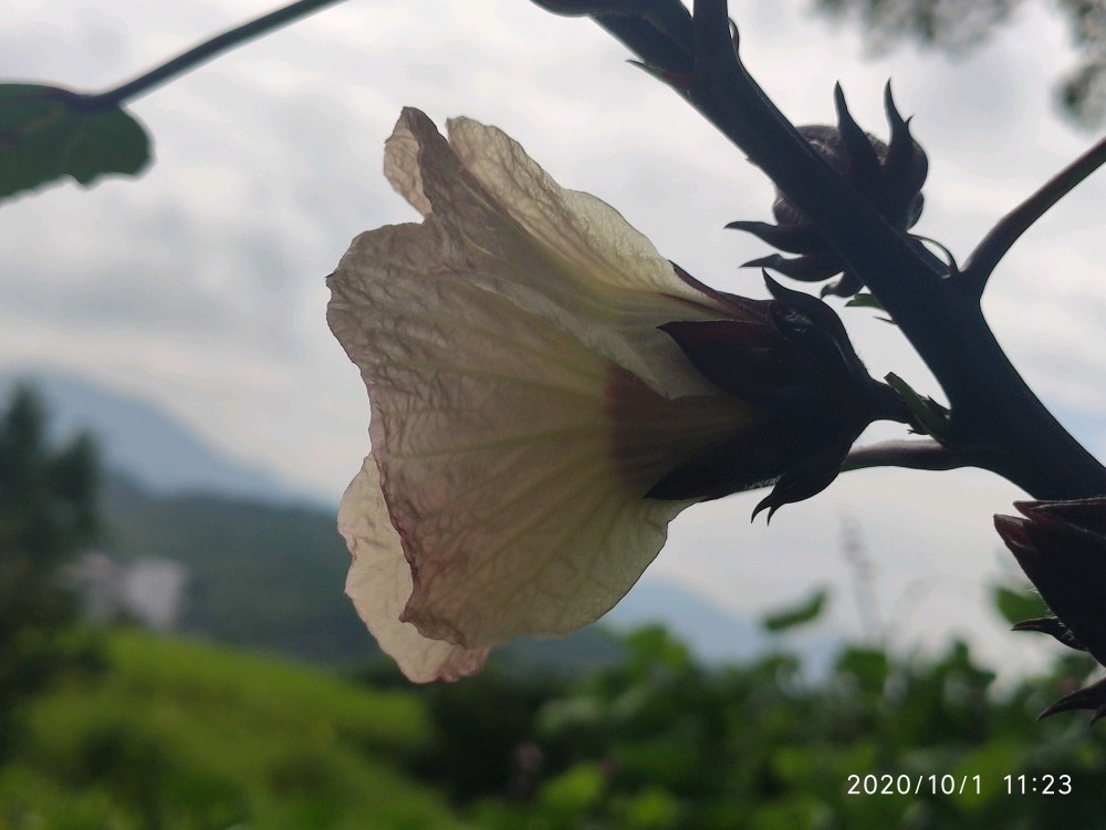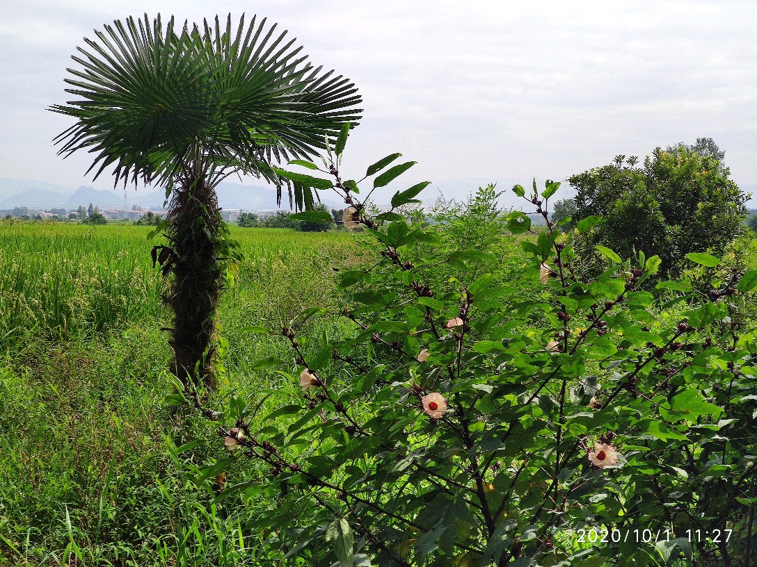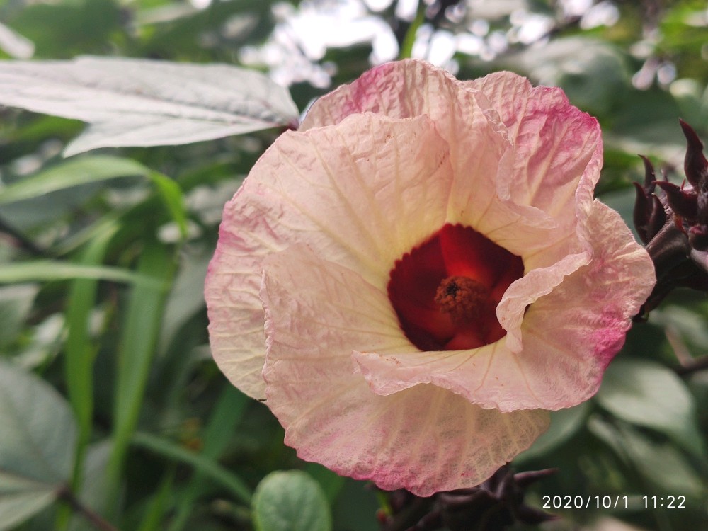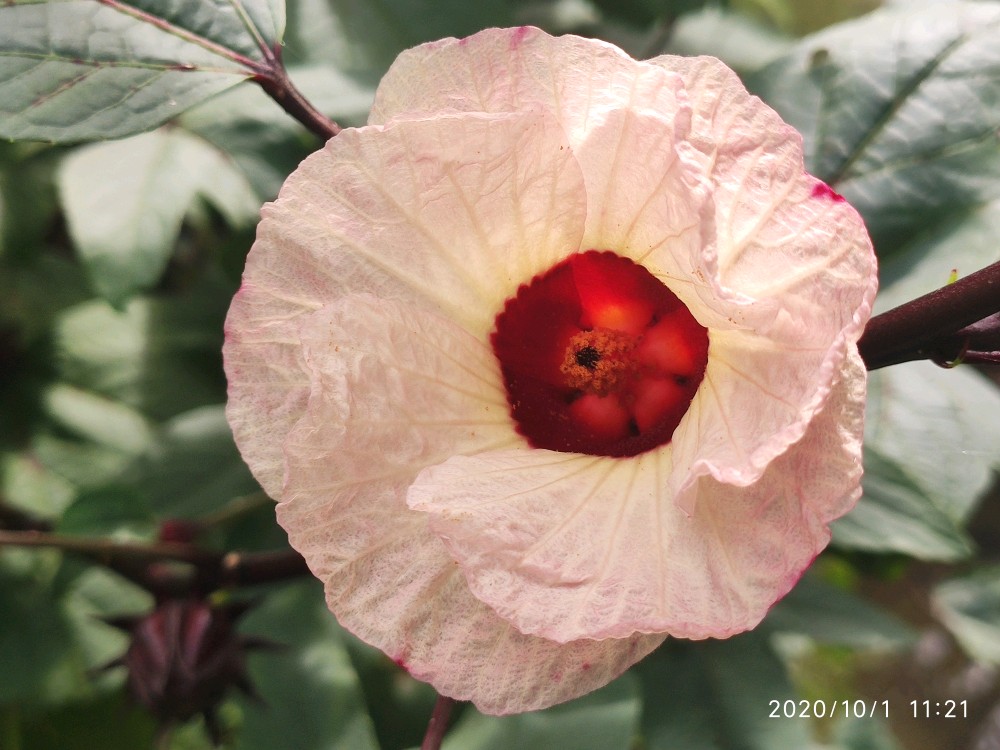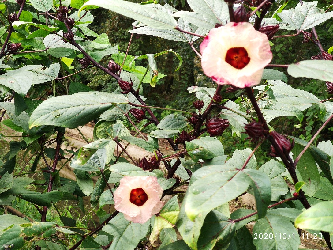 知道它开花了,心里便总惦记着它。隔三差五的总要特意拐到有它的路上,这不又来看玫瑰茄了