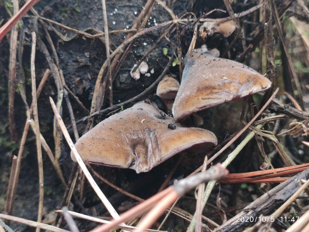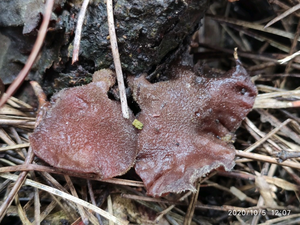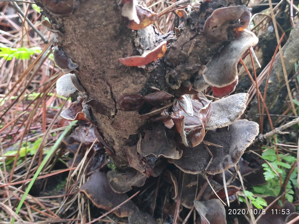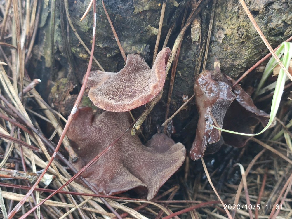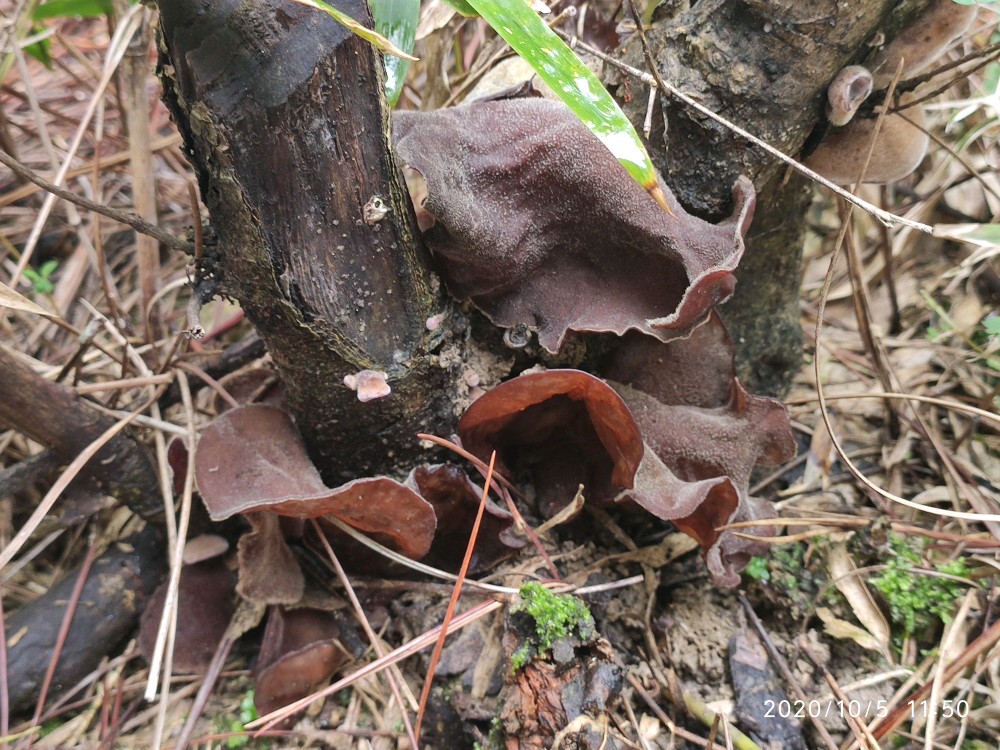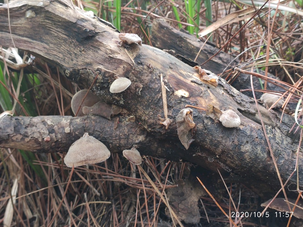 沿着松树林的边缘走了一圈,看看野花野草,一开始压根就没看到野生小木耳。虽说我去过几次,可是对于路痴的我来说完全记不住哪个位置是小木耳的栖息之所。就这么走着走着,好容易看到一片区域有点老木桩,我便仔细瞧了瞧,居然找到一个小木耳。接着采木耳才正式提上日程。弟弟没有采过小木耳,他不知道小木耳长在什么地方。然后在我的指点下,他很快便青出于蓝了。男孩子在山野中惯了的,再加上其敏锐的洞察力,基本都是他在找,我在采。