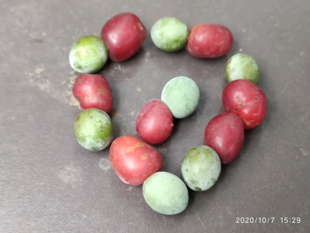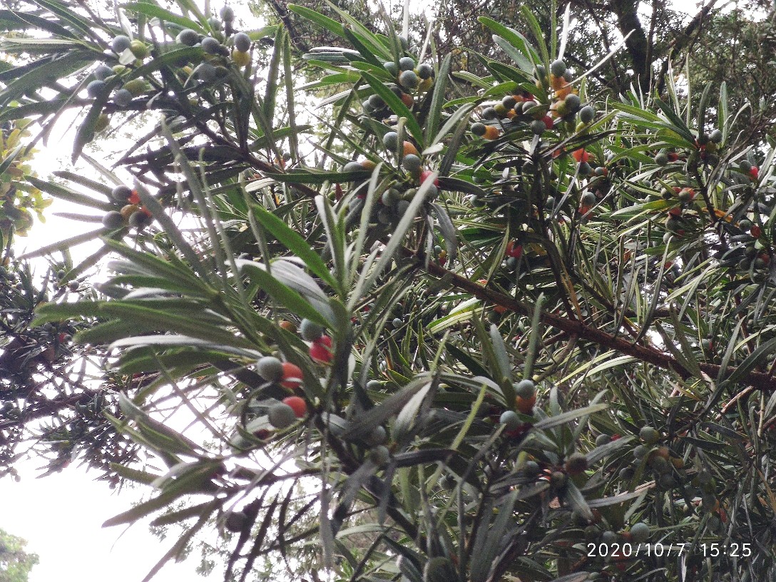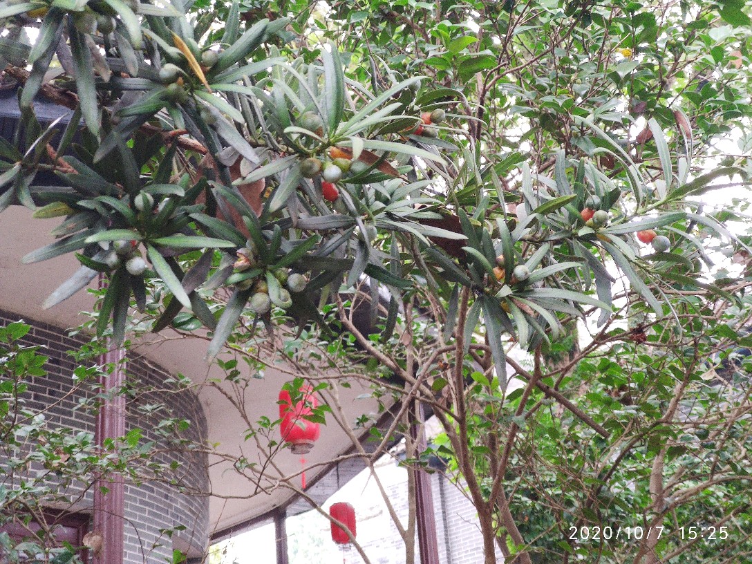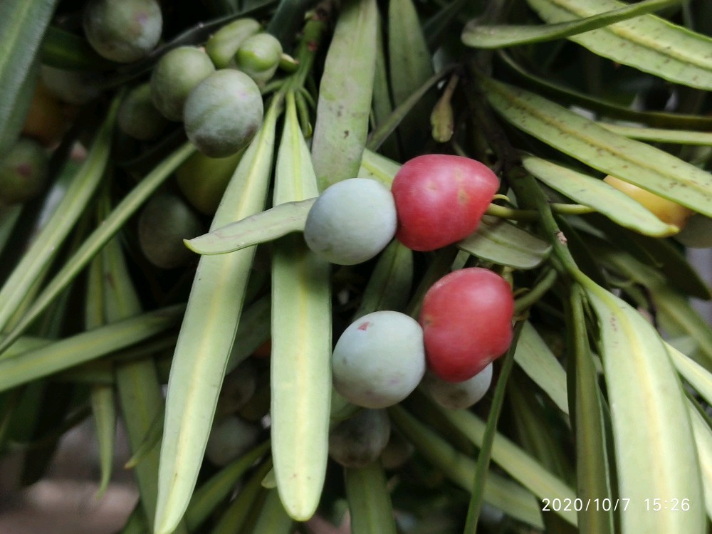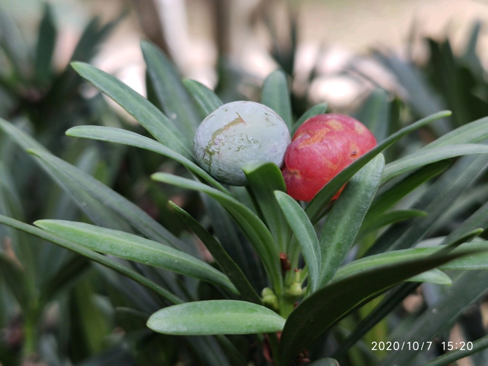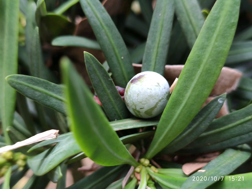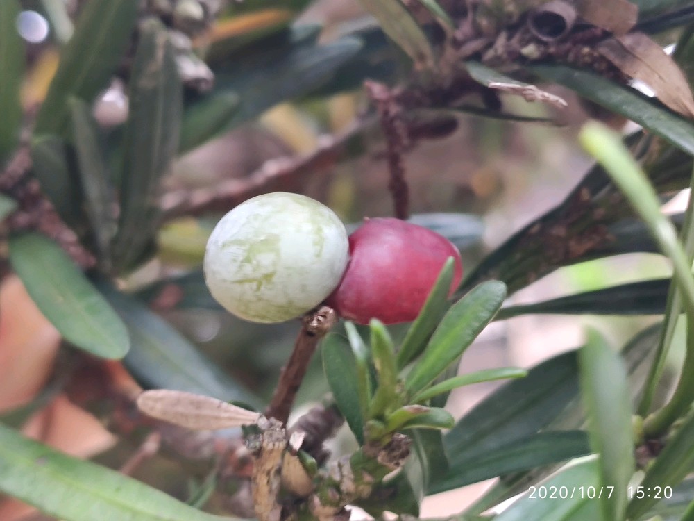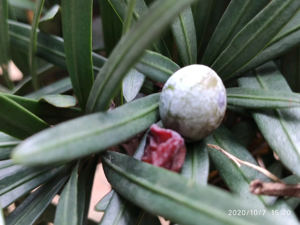 一开始其实并没有注意到它,而是看到门口的两株小的迎客松。你知道的,看到迎客松我总还是喜欢去观察它有没有挂果,这次也不例外。一瞅居然发现了一枚,接着又发现好几枚。不过心里其实心里觉得纳闷,这些果子为什么都不是长在树上,而像是放在上面或者说是掉在上面的。找了好久也是如此,然后不经意间才发现,原来旁边有一棵更大的,硕果累累。小株上的原来都是这上面掉下来的。