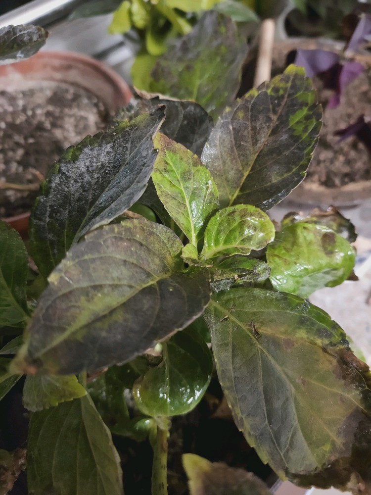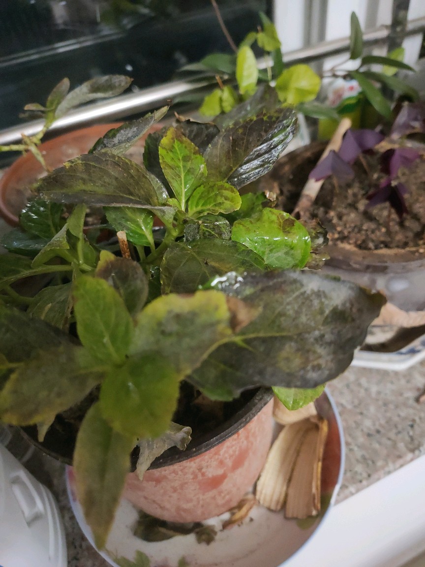 请哪位高手指点,我的绣球叶子怎么了?在室外刚搬回室内
