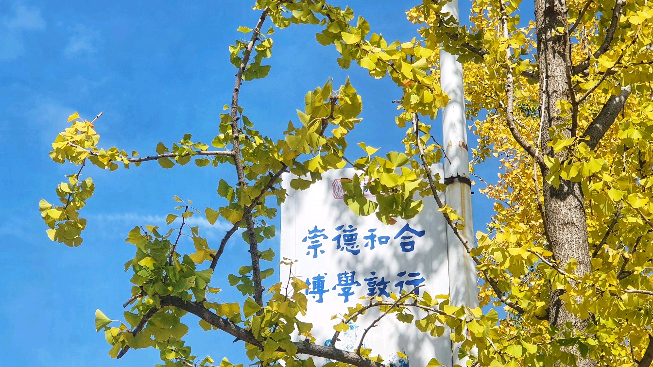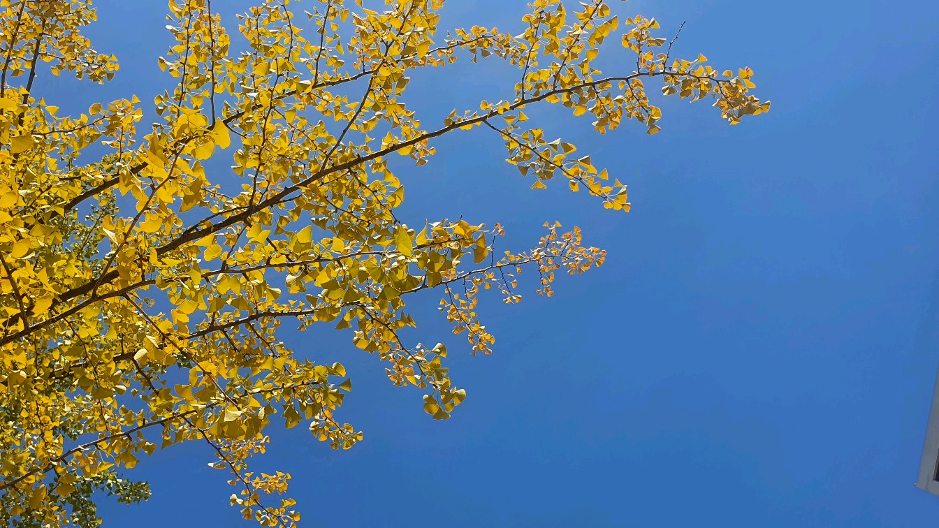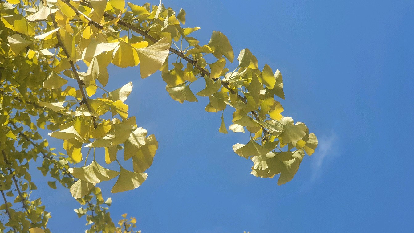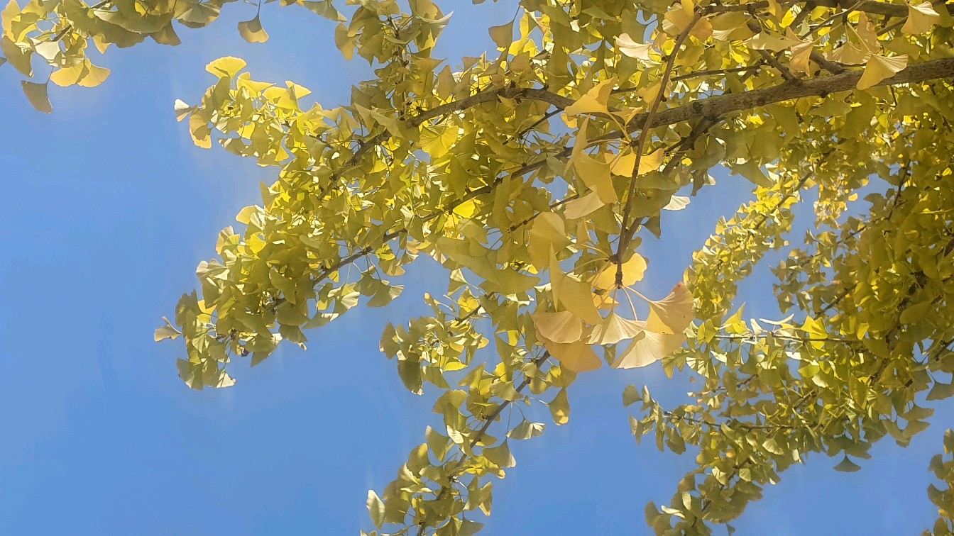 今天天气清澈明朗,银杏叶愈发亮了。秋风袭来,银杏小扇婆婆娑娑,像极了波光粼粼的水面。