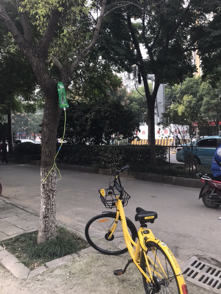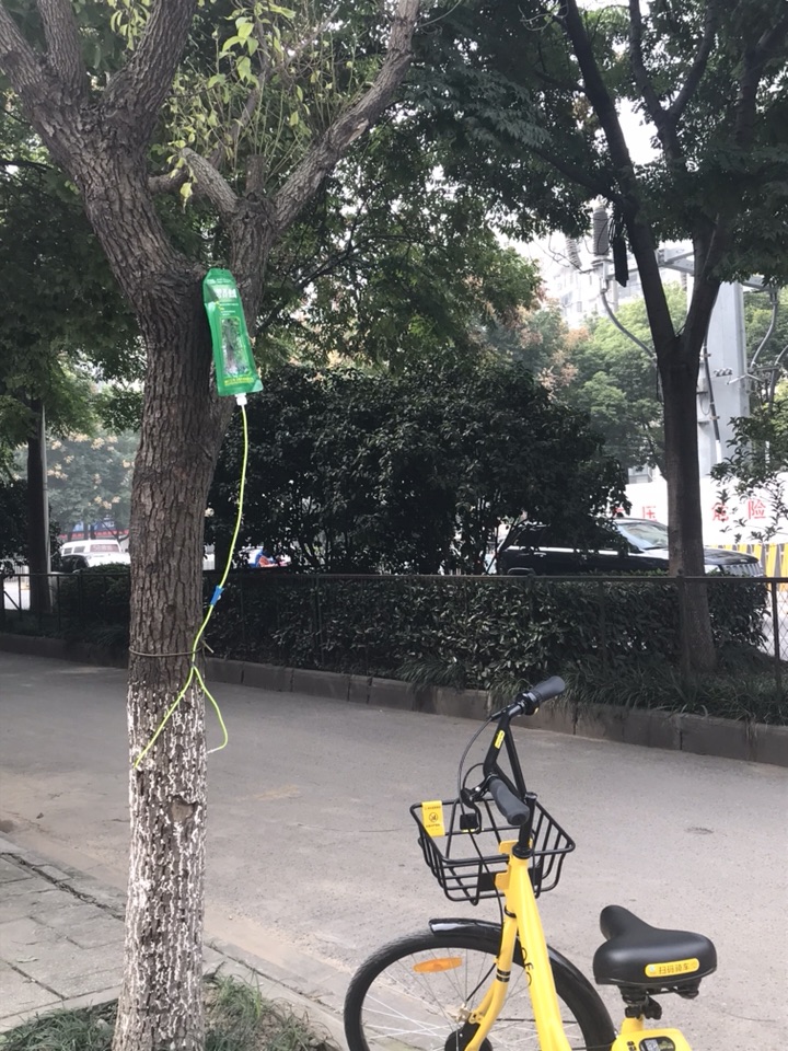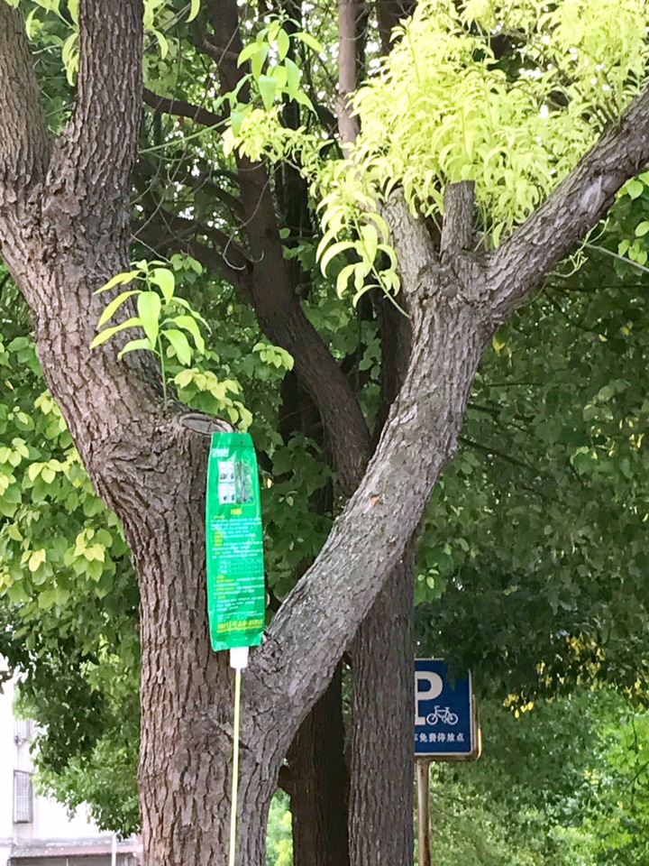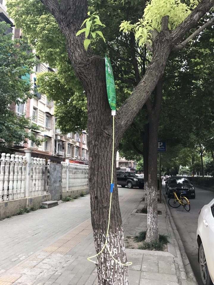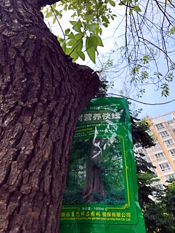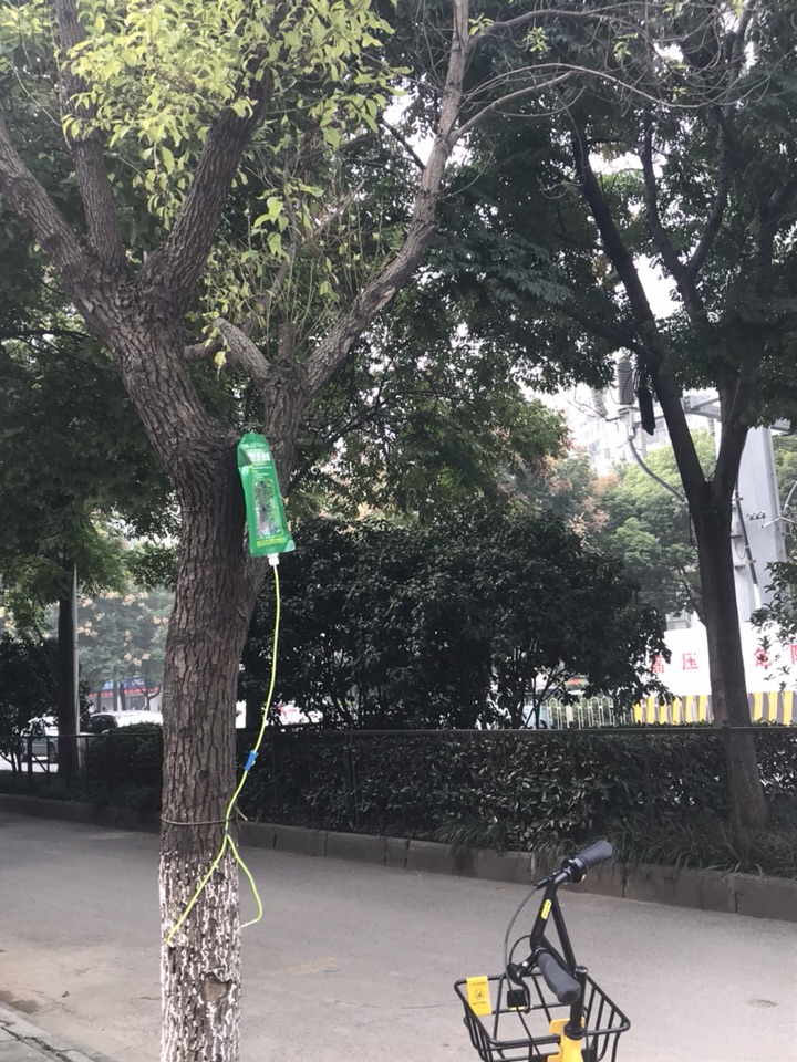 中午发现有棵樟树挂上了吊瓶,走近一看还是"营养快线"!🤣🤣🤣