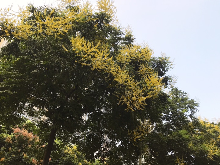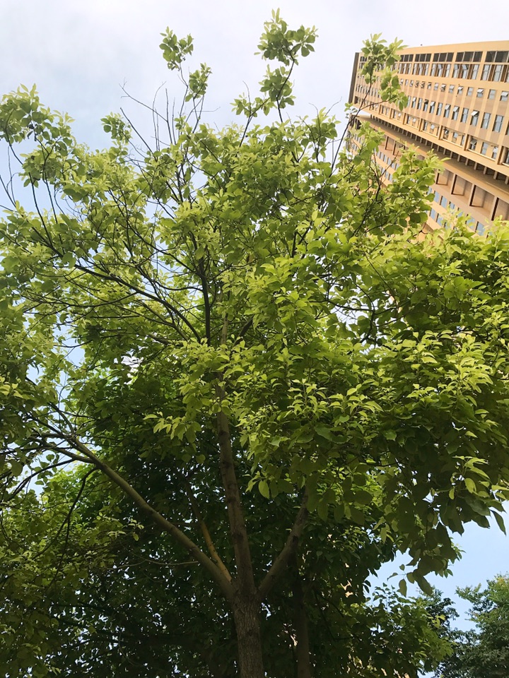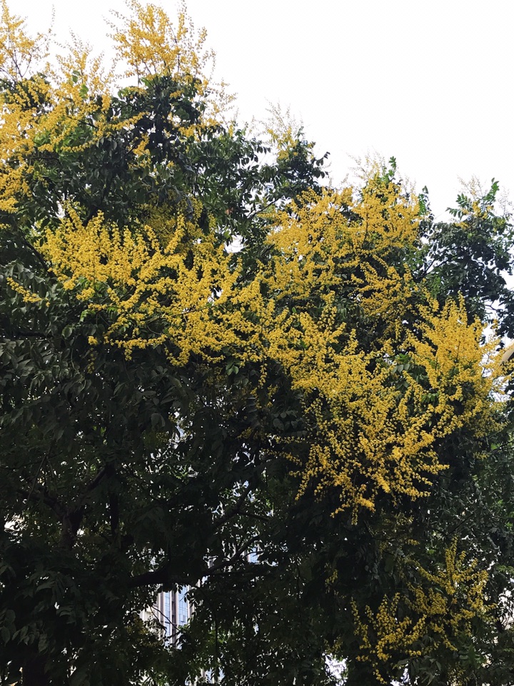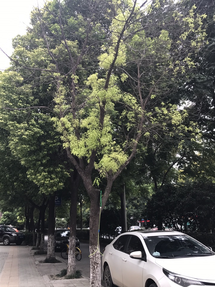 小区路口左樟右栾郁郁葱葱,大热天站在树下等车也很清凉。