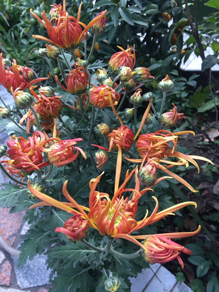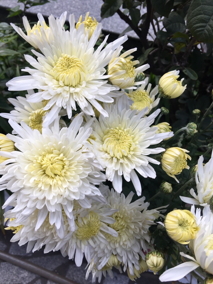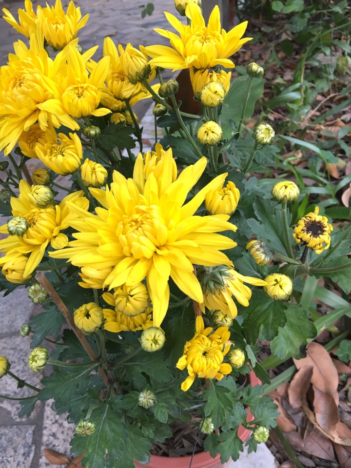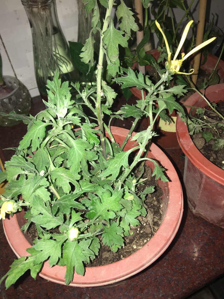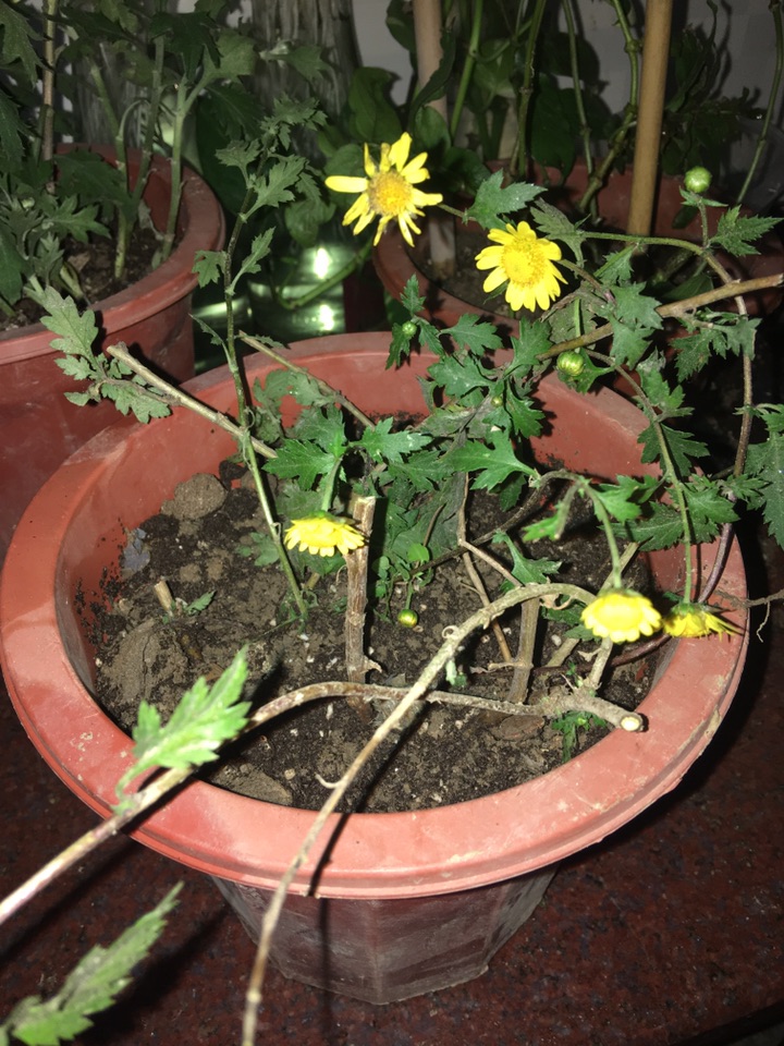 这两棵白菊是年三十行花街捡回来一支花,剪成两段插的,原来只是个小花蕾。黄菊是四星期前用小苗插的。野菊花刚刚插的,在路边扯了一根枝条剪开几段就插了。