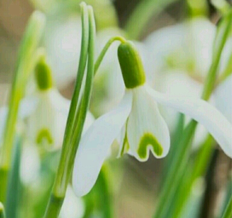 雪滴花,花语: 希望,生命力强,勇往直前的力量。原产于中欧地中海沿岸,在中国长江下游有比较广的种植。花瓣洁白如玉,花瓣末梢带点儿嫩嫩的豆沙绿,形状呈心形,花瓣也是心形。