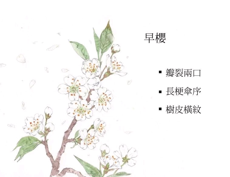 分辨樱花最容易,独特的花裂和横纹树皮。