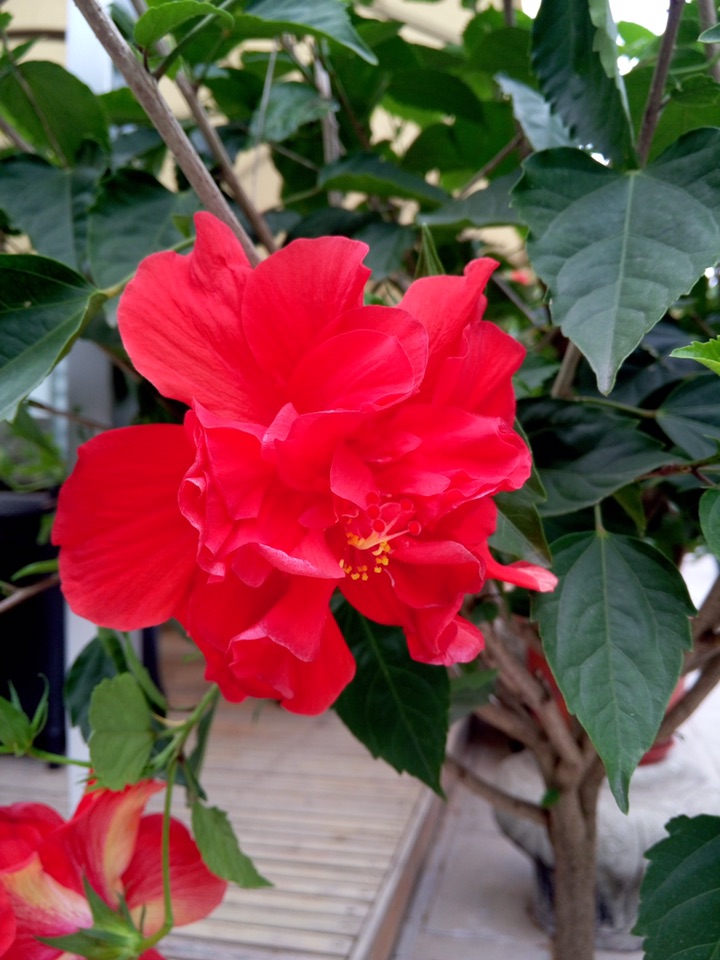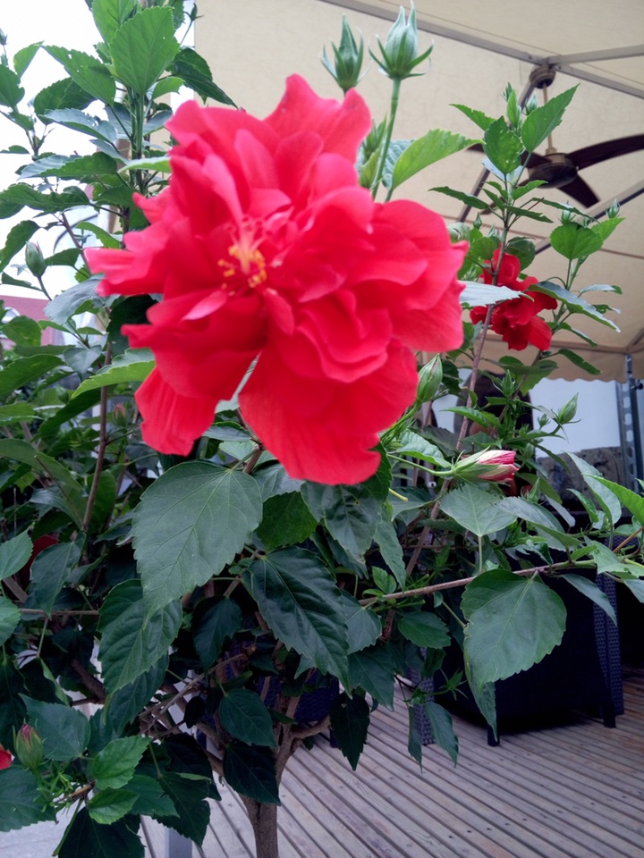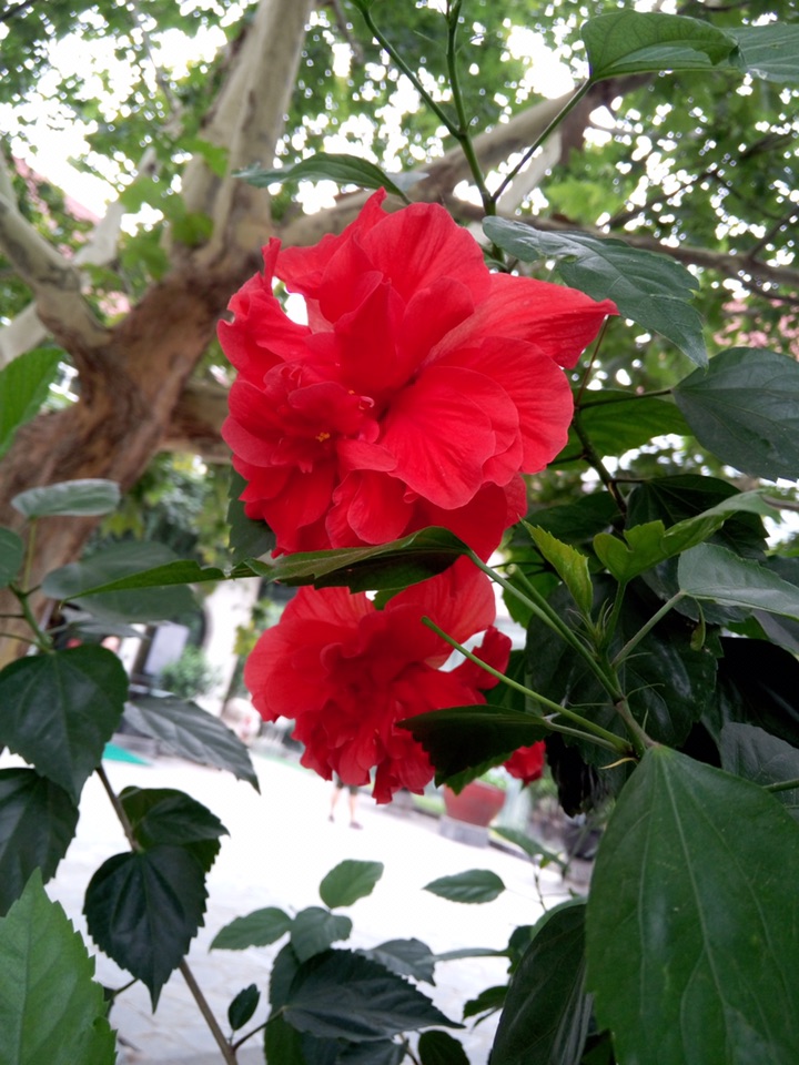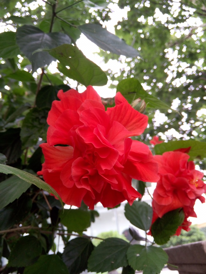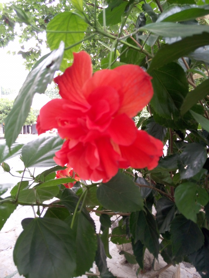 扶桑花,朵比较大,颜色鲜红,很正的红色。花瓣婀娜多姿。