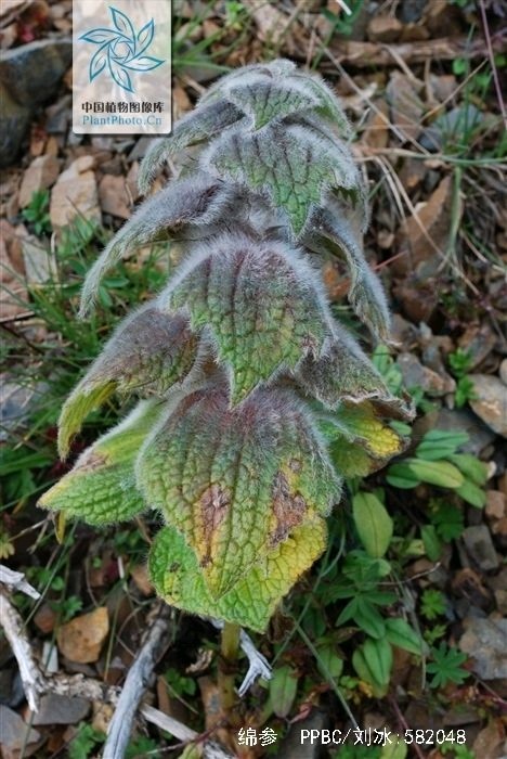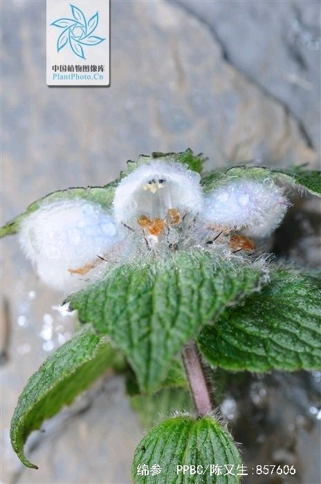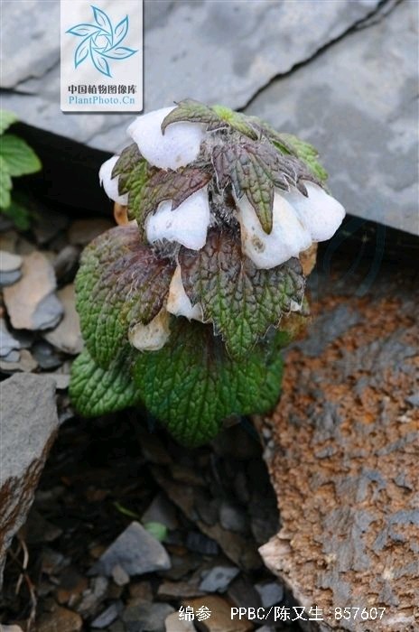 绵参,别名毛草《中国植物科属检索表》。多年生草本,全株被绵毛,高10-20cm。根肥厚,圆柱形。茎直立,下部常生于石块堆中,呈白色、肉质,无毛,叶为苞片状,白色无毛。茎上部叶大,两两交互对生,叶片菱形或圆形,长宽约3-4cm,顶端叶较小,先端急尖,基部宽楔形,边缘在中部以上具圆齿状锯齿,两面密被绵毛;叶柄短或近于无柄。轮伞花序6花,无花梗;小苞片刺状,长达1.2cm,密被绵毛;花萼宽钟形,长约15mm,隐藏于叶丛中,外面密被绵毛,内面在萼齿先端及边缘被绵毛,其余部分无毛,齿5,三角形,近等大,长约7mm;花冠淡紫或粉红色,长2.2-2.8cm,上唇大,盔状,向下弯曲覆盖下唇,外面密被绵毛,下唇小,3裂,中裂片略大,先端微缺;雄蕊4,前对较长,先端突起,花丝有柔毛,后对药丝基部增厚;柱头2裂;花盘平顶。小坚果倒卵圆状三棱形,长约3mm,黄褐色。花期7-9月,果期8-10月。