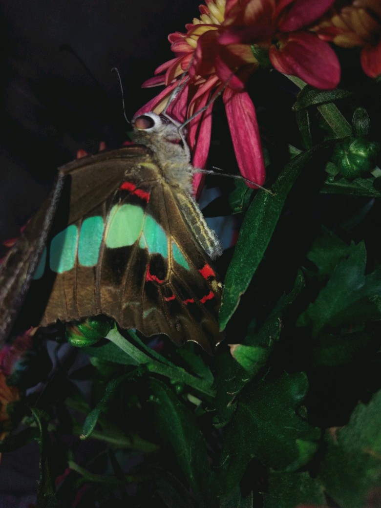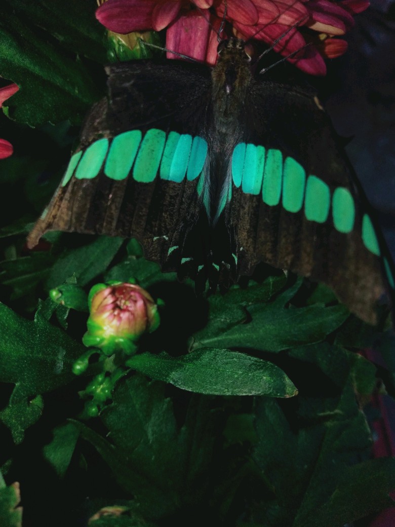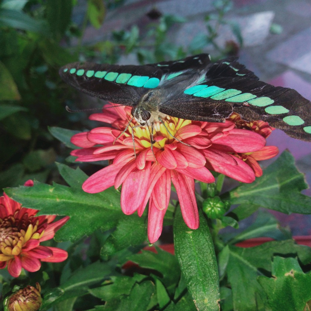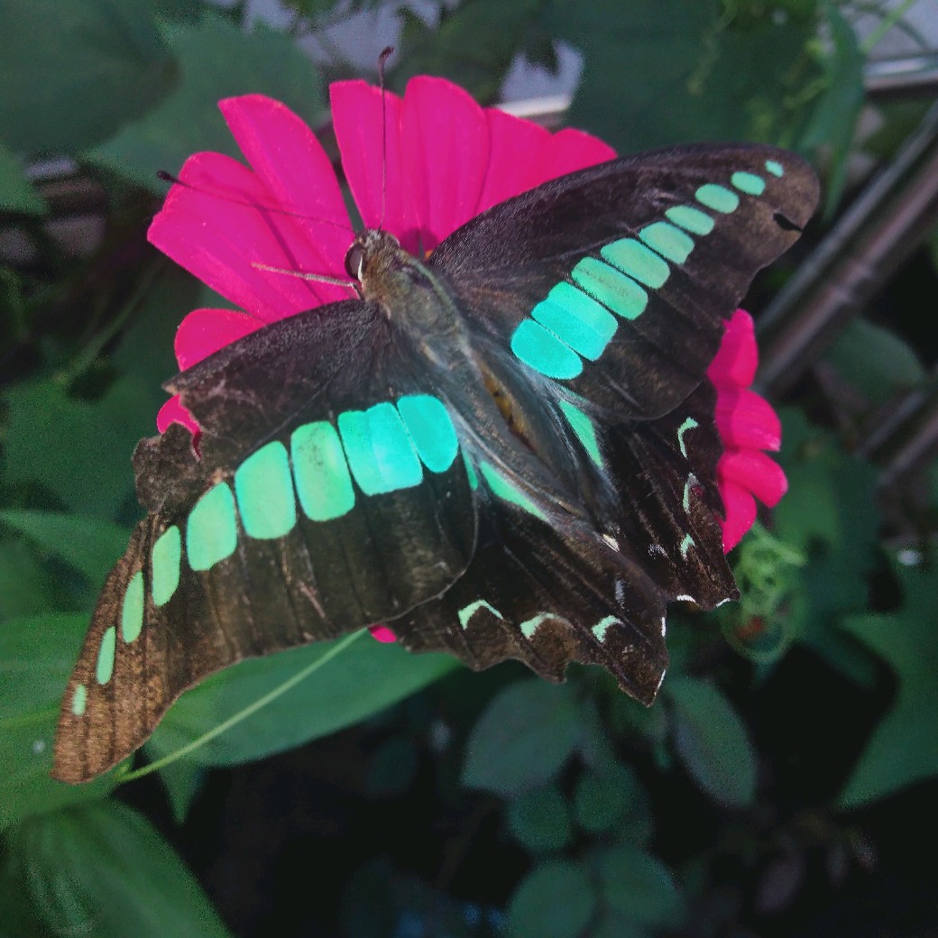 这是一只蓝带青凤蝶,似乎是有些常见的,翅膀上的色块是有变化的,看起来真的很神奇,还带点反光。不过这儿最常见的大蝴蝶当属玉带凤蝶和柑橘凤蝶了,父亲种了三四颗橘,柚,因而在某些时段常能见到它们