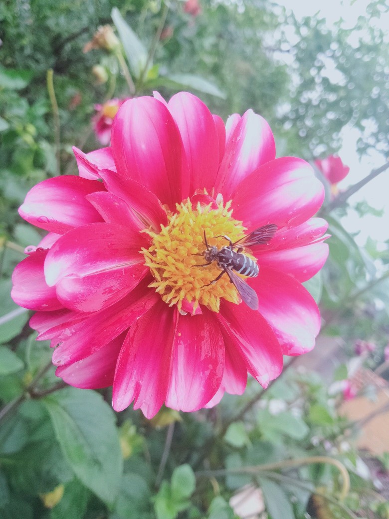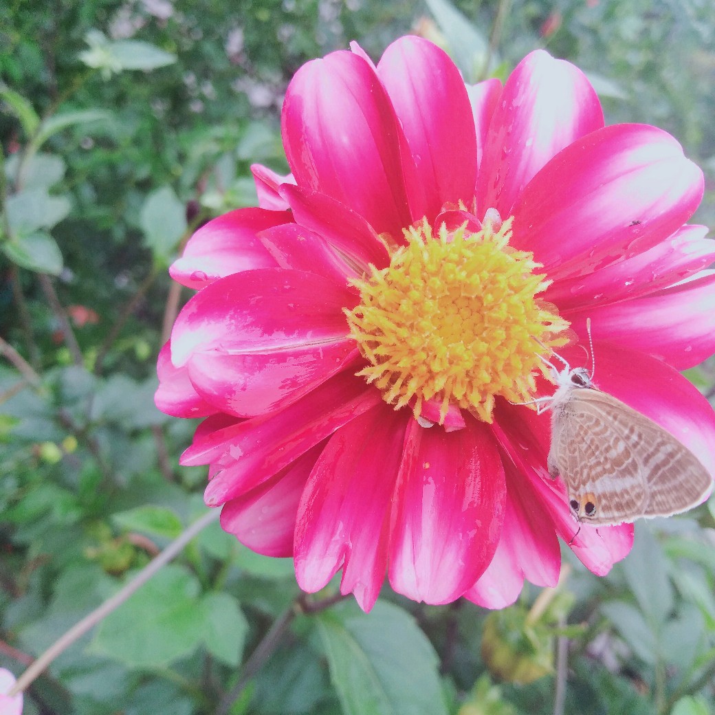 台上的一簇大丽花似乎一直是蜂蝶亲睐的对象,时常是蜂蝶萦绕着,连一些苍蝇也要在上面待一下。我于是尝试捕捉它们的倩影