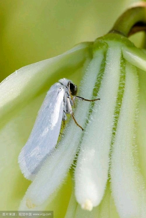 蛾的口腔有一种细长而能弯曲的吻管用以收集花粉。当黑夜时,雄蛾便四处飞行寻找雌蛾,最后便把花粉传到其它的花朵中去。雌蛾有一长的放卵器,它能利用这放卵器刺穿子房的组织。交尾后的雌蛾便爬上花药上采集花粉,把花粉搓结成一大块可达它的头部3倍。