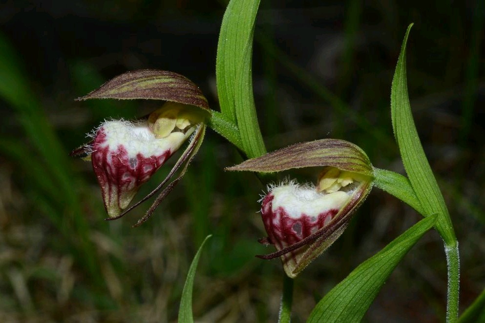 鹰嘴杓兰(学名:Cypripedium arietinum R.Br.):地生草本,具短或长的横走根状茎和许多较粗厚的纤维根。茎直立,叶2至数枚,互生,叶片通常椭圆形至卵形。花序顶生,通常具单花或少数具2-3花,花苞片通常叶状,明显小于叶;花大,通常较美丽;中萼片直立或俯倾于唇瓣之上;2枚侧萼片通常合生而成合萼片;花瓣平展、下垂或围抱唇瓣,唇瓣为独特的锥形尖,具很短的花丝;花粉粉质或带粘性;退化雄蕊通常扁平,柱头肥厚,略有不明显的3裂,表面有乳突。果实为蒴果。