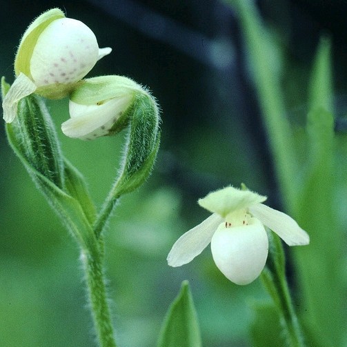 富兰克林杓兰(学名:Cypripedium passerinum Richardson):地生草本,具短或长的横走根状茎和许多较粗厚的纤维根。茎直立,叶2至数枚,互生,叶片通常椭圆形至卵形。花序顶生,通常具单花,花苞片通常叶状,明显小于叶;花大白色,花瓣上有类似麻雀蛋的紫色斑点。中萼片直立或俯倾于唇瓣之上;2枚侧萼片通常合生而成合萼片;花瓣平展、下垂或围抱唇瓣,唇瓣为深囊状,具很短的花丝;花粉粉质或带粘性;退化雄蕊通常扁平,柱头肥厚,略有不明显的3裂,表面有乳突。果实为蒴果。