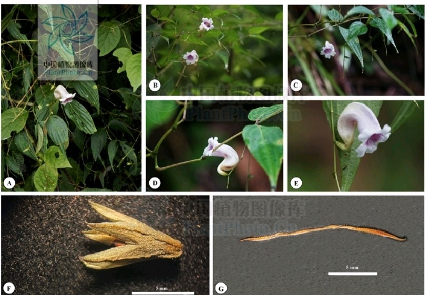 形态特征:Undershrubs 1–2 m high, gregarious. Stems subterete, glabrous, slightly swollen at node. Leaves slightly anisophyllous, smaller one ca. 2/3 of the larger one in size; petiole 3–7 mm long or petiole of smaller leaf in each pair shorter, sulcate, glabrous; blades ovate to lanceolate-ovate, smaller ones 4.2–6.9 × 1.2–2.0 cm, larger ones 8.2–10.1 × 2.2–3.2 cm, both surfaces glabrous, densely covered with numer- ous linear cystoliths, secondary veins 3–5 on each side of midvein and prominent on both surfaces, base rounded to broadly cuneate, slightly oblique, margin serrulate, apex acuminate and narrowly caudate. Inflorescences of axillary spikes, simple or rarely 2-furcate, slender, (7–) 11–22 cm long; rachis glabrous; bracts and bracteoles not seen, caducous. Flowers (0.6–) 1.0–2.5 (–3.0) cm apart on rachis. Calyx 7–8 mm long, glabrous, 5-lobed to middle; lobes ovate, equal, margins narrowly scarious, 1-nerved abaxially, conspicuous after drying, apices acuminate. Corolla 2.8–3.3 cm long, cam- panulate, outside and lobes pinkish-white, inside purplish-pink, outside glabrous, in- side glabrous except for bifarious hirsute retaining the style ; tube basally cylindrical, ca. 3 mm wide and ca. 6 mm long, then bent to ca. 90° and gradually wid- ened to 9–12 mm wide at middle and 1.6–1.8 cm long, then secondly bent to ca. 90° and tube upper cylindrical 9–12 mm wide and 1.6–1.8 cm long; lobes broadly elliptic, 8–9 × 7–8 mm, apices emarginate . Stamens 4, didynamous, included; the united part of filaments glabrous at base, with dense villous on middle and margin, with slightly sparse villous on upper (Fig. 3E), shorter pair ca. 2 mm long, longer pair ca. 4 mm long; anther thecae oblong, ca. 4 mm long. Pollen grains prolate in outline,74.1 (72.2–76.1) × 49.7 (48.1–50.4) μm, P/E = 1.49, tricolporate, ribbed pseudocolpi 12, exine reticulate (Fig. 4). Ovary ca. 5 mm long, glabrous; style ca. 1.8 cm long, with sparse gland-tipped trichomes. Capsule not seen.