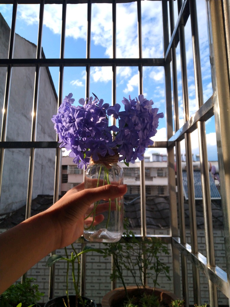 在天空的对比下,看蓝雪花,它是紫色的