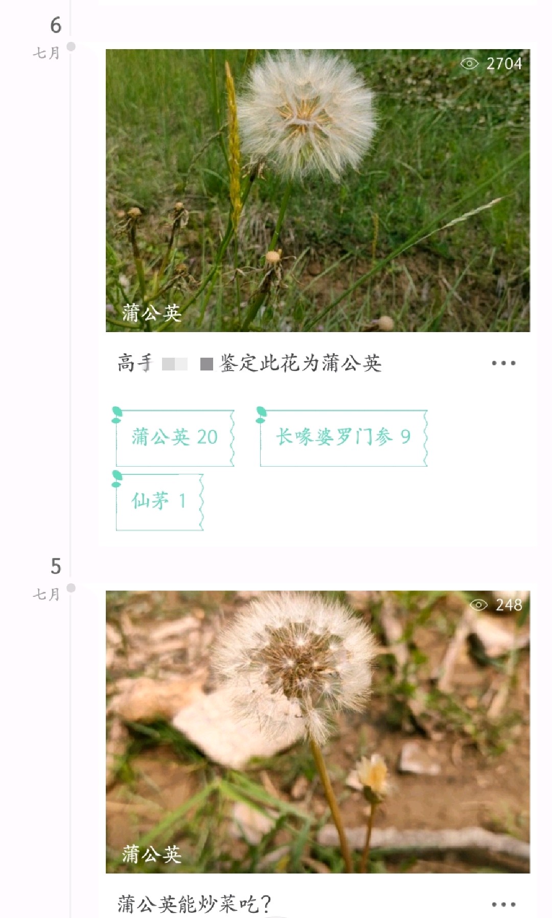 可以看到,蒲公英的球球里有很多小白点,而长喙婆罗门参没有这种特征~