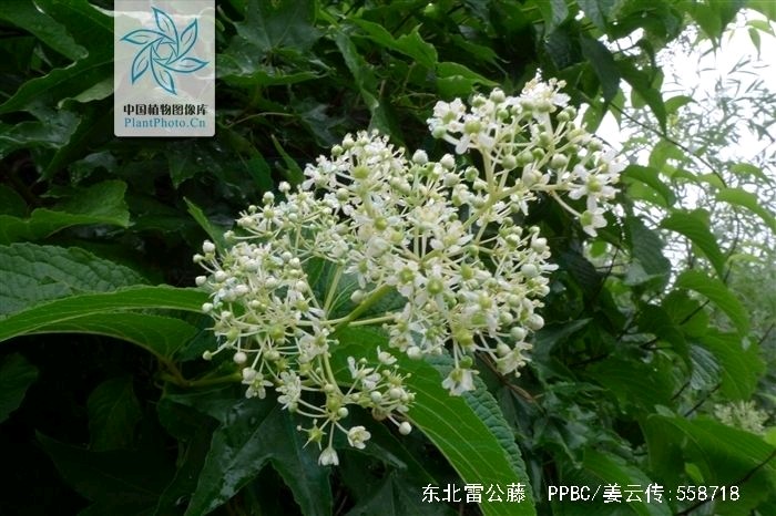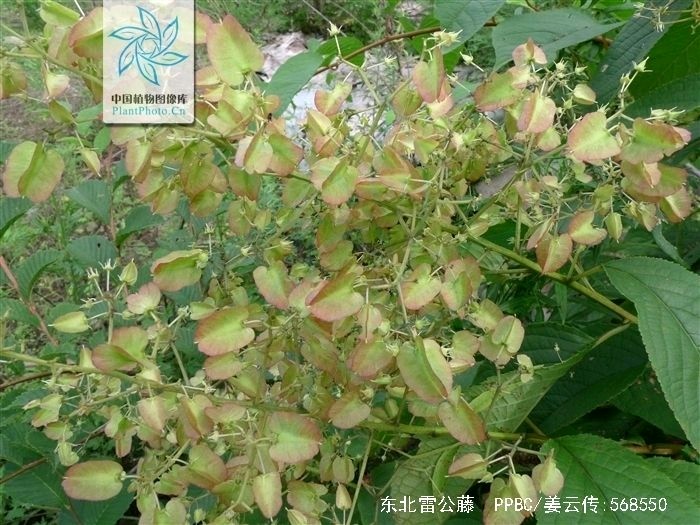 东北雷公藤,又名黑蔓。藤状灌木,植株高约2m。枝褐色,小枝淡红褐色,常呈六棱状,无毛,有小疣状皮孔。叶互生;叶柄长1-4cm;叶片长圆形至倒卵形,长5-20m,宽3-12cm,先端尾状尖或渐尖,边缘有不整齐钝锯齿,基部圆形。顶生聚伞圆锥花序,长10-30cm,花杂性,白绿色,径约5mm;花萼5;花瓣5;雄蕊5,着生于浅杯状花盘的边缘靠外部;两性花的子房有3棱。蒴果具3薄膜质翅,长2-1.5cm,边缘微波状。种子长柱形,暗红色。花期7-8月,果期8-9月。