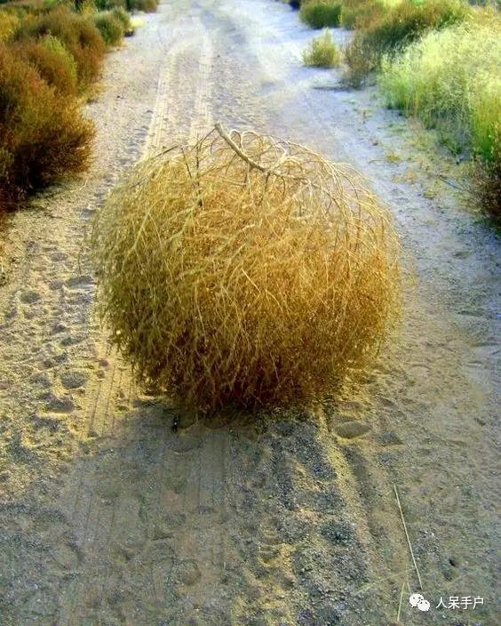 风滚草(学名:Salsola tragus L. ;英文名:Tumbleweed):又叫俄罗斯刺沙蓬。 一年生草本,高10-100厘米,半灌木或灌木。有糙硬毛和乳头状小突起。茎直立,很少上升,从近基部分枝,分枝弧形,近地部分偶尔匍匐。叶互生,无柄,叶片丝状或狭线形,宽小于1毫米,非肉质,基部不肿,花序通常为穗状,有时为圆锥状;1花。果实为胞果,球形,果皮膜质或多汁呈肉质;种子横生,斜生或直立。