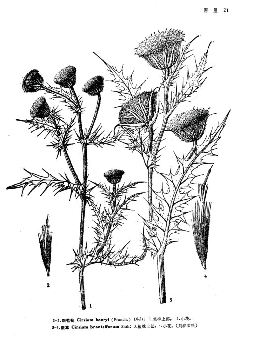 上部茎叶长椭圆状披针形,长13厘米,宽4厘米,羽状深裂,基部耳状扩大半抱茎;侧裂片6-7对,偏斜三角形,顶端急尖,有长针刺,边缘有稀疏的刺齿及针刺,齿顶有针刺,全部针刺长3-6毫米,接头状花序下部的叶与上部茎叶同形并等样分裂,但较小。全部茎叶两面同色,绿色,被多细胞短节毛或节毛成糠秕状,沿脉的毛稍稠密。头状花序下倾,在茎端排成总状花序,植株通常含有4 个头状花序,花序梗长或短,通常裸露,被稠密的多细胞长节毛。总苞宽钟状,无毛,直径3-4.5厘米。总苞片6层,镊合状排列或至少不为明显的覆瓦状排列,近等长或内层渐短;外层或近外层苞叶状,草质,钻状长椭圆形或钻状披针形,长3.5-4 厘米,宽3-5毫米上部钻状渐尖,顶端有短针刺,边缘微齿裂及针刺;中内层长椭圆形或宽线形,长达2.1厘米,顶端急尖;最内层狭线形,与中内层等长或稍短。小花紫红色,花冠长2.2厘米,细管部长1厘米,檐部长1.2厘米,5深裂。瘦果不成熟。冠毛褐色,多层;冠毛刚毛羽毛状,向顶端渐细,基部连合成坏,整体脱落。花期7月。[2]