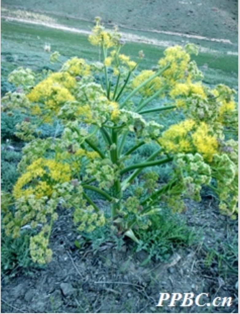复伞形花序径8-12厘米,中央花序近无梗,侧生花序1-4,无总苞片;伞辐5-25,近等长,被柔毛:伞形花序有10-20花,小总苞片宽披针形,脱落;花瓣黄色,中脉色深,有毛;