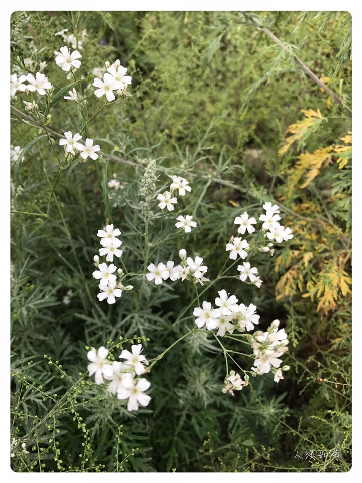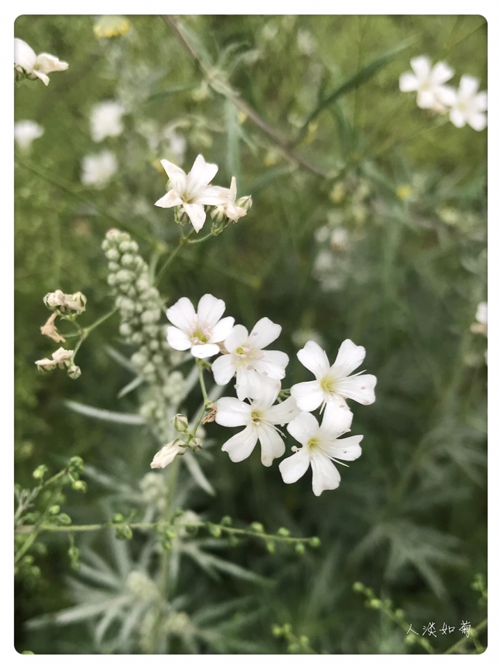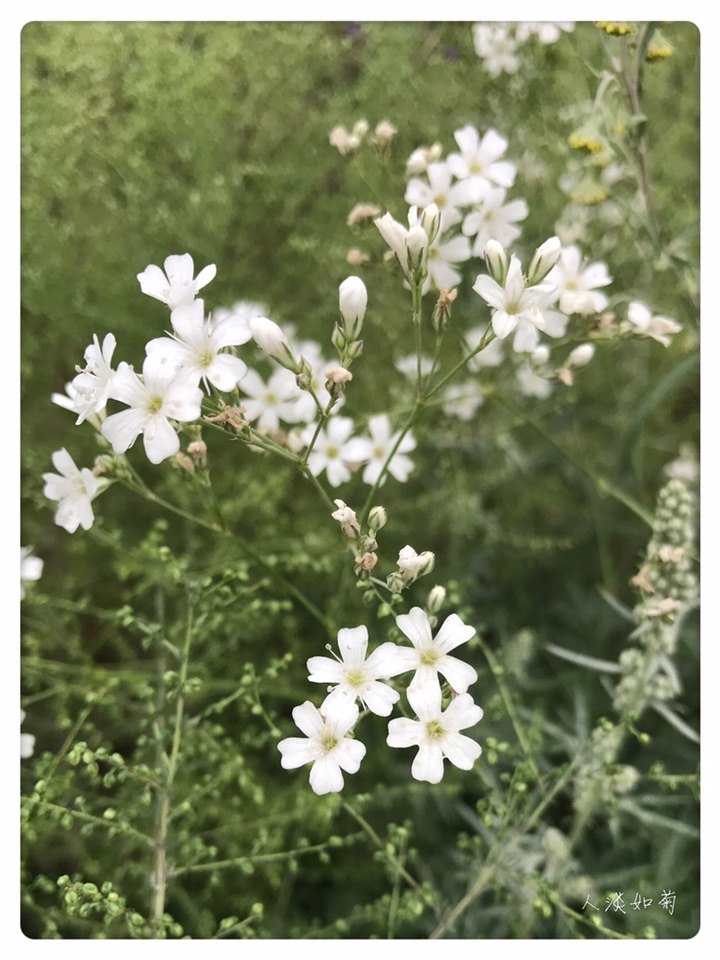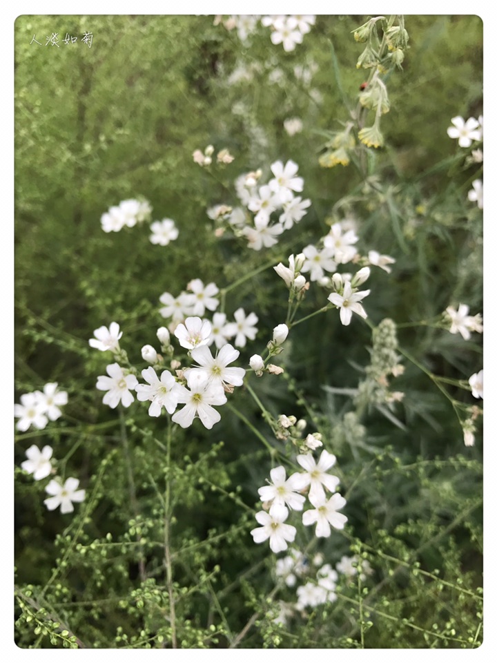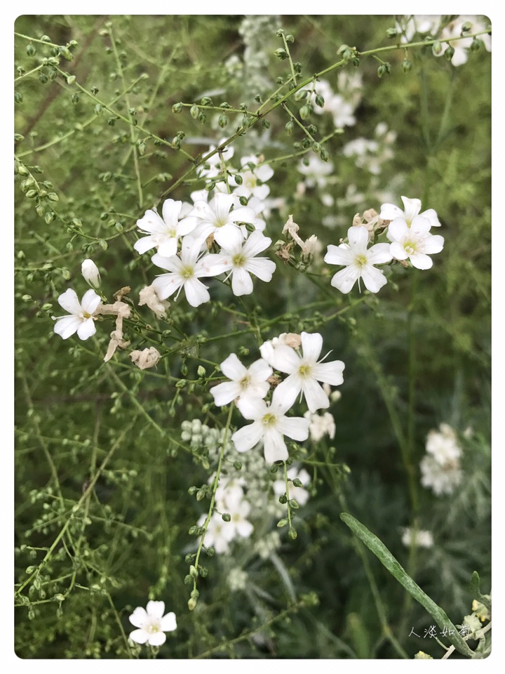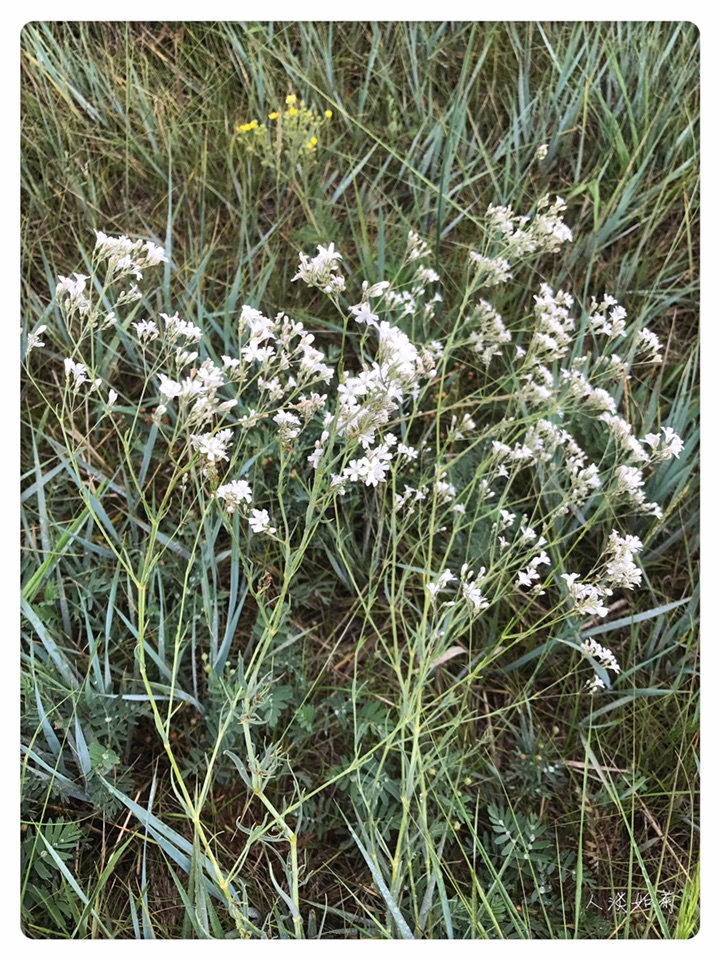 在锡林郭勒盟东乌珠穆沁旗的草原上洁白柔弱的长蕊石头花成簇散在绿色的草地上随风而舞,株型虽不是很美但花很精致。