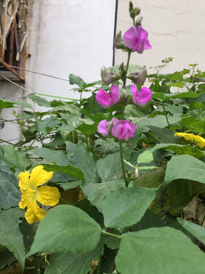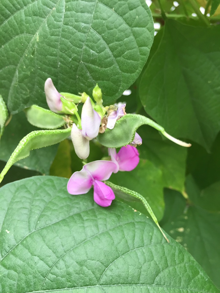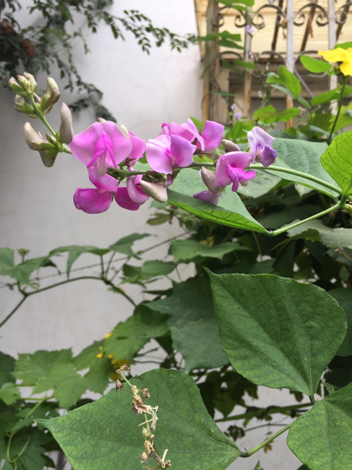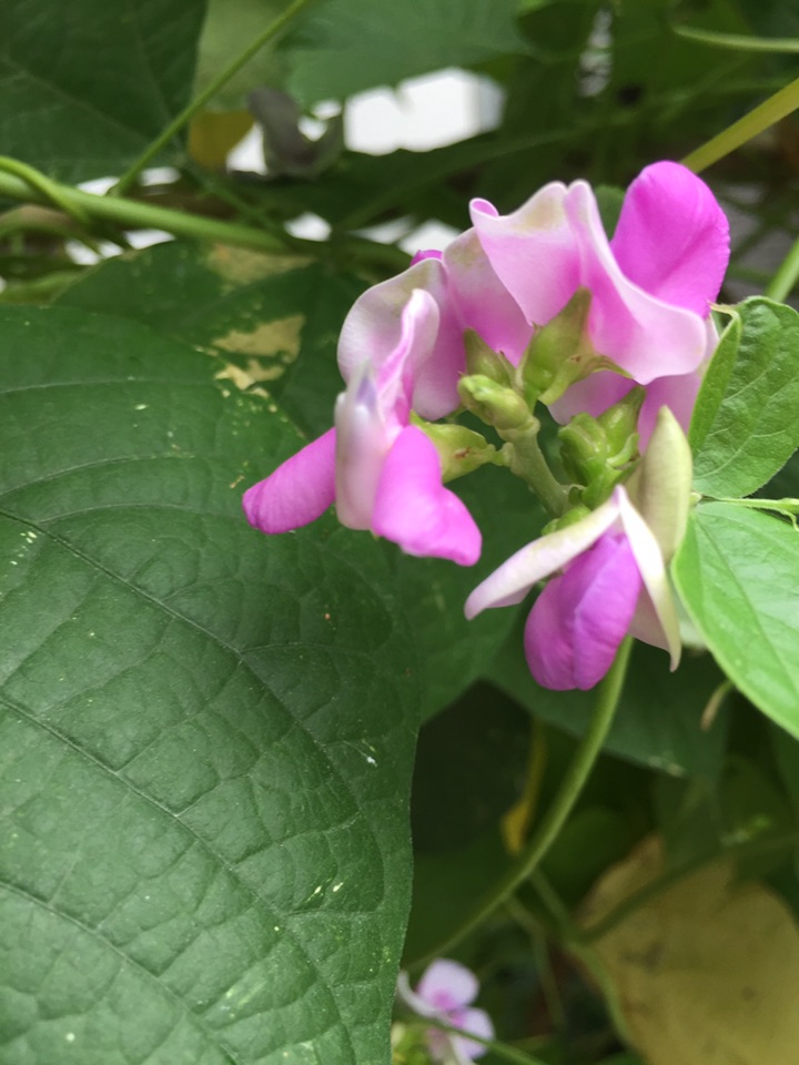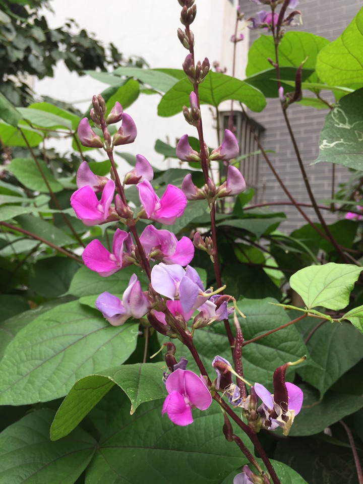紫色的小花开成串儿,结出耳朵形状的有特殊气味的山扁豆。炒熟了味道不错。