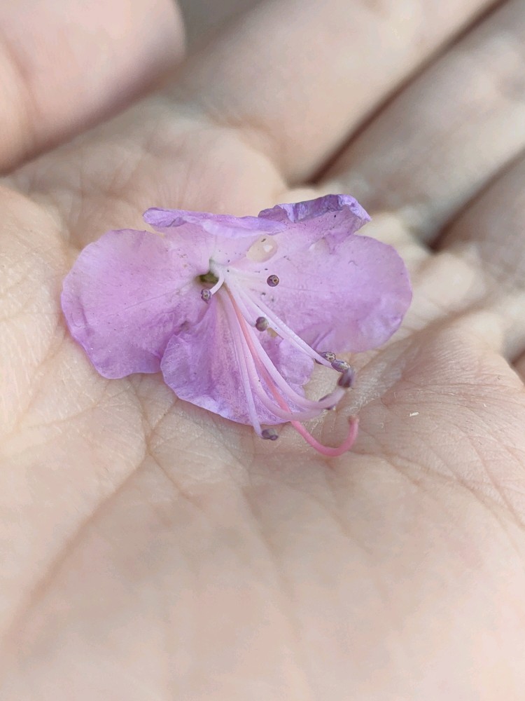 今天一出门,就捡到一朵小花。看看形态,应当是某种杜鹃。我们这里当然没有野生杜鹃生长——那就是别人买来的切花,大概率是兴安杜鹃——碰巧落在我家门前。细细看来,这花虽略有萎败,却仍不掩其丽质。