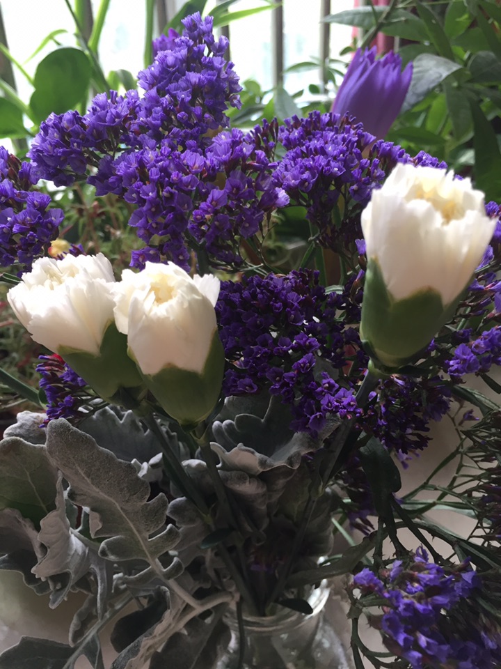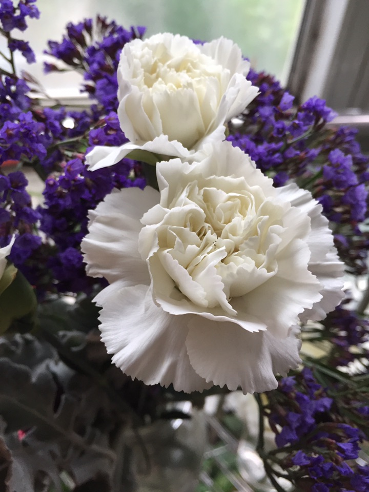 紫色的勿忘我衬着洁白的康乃馨,感觉很棒!
