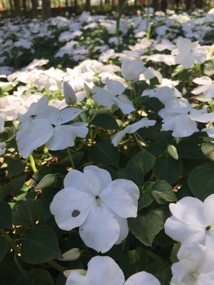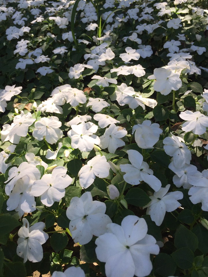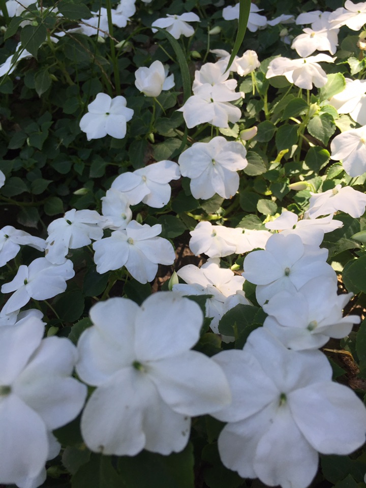 以为是长春花,离近了会发现错了。洁白的凤仙花第一次见到。