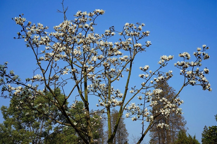 和很多浓重色彩的乔木花卉也不同,它清新明丽、格调高雅,在蓝天的映衬下,凸显尊贵。又因它高悬空中,令人有可望而不可及之感,让人切切实实感受到:“可远观而不可亵玩焉”!