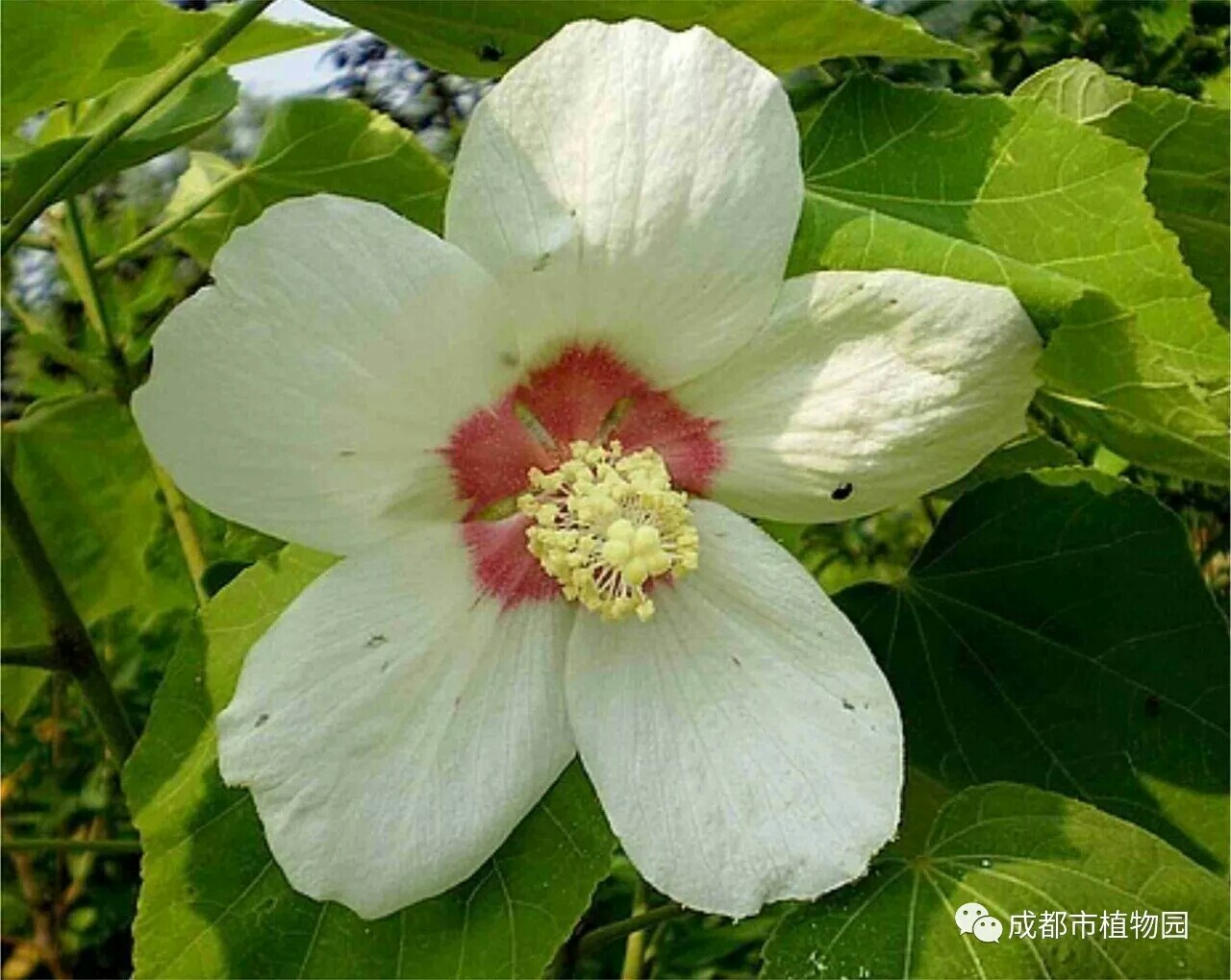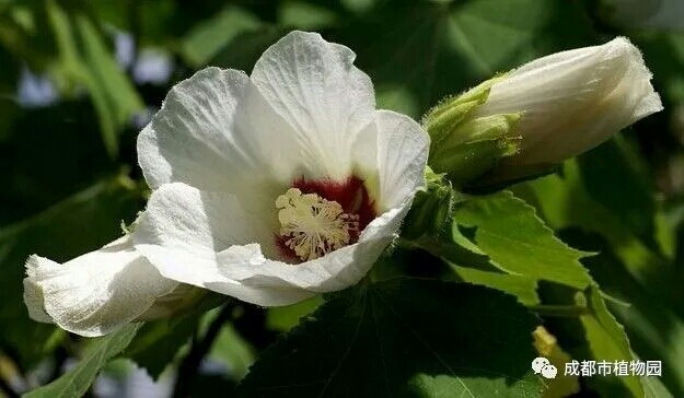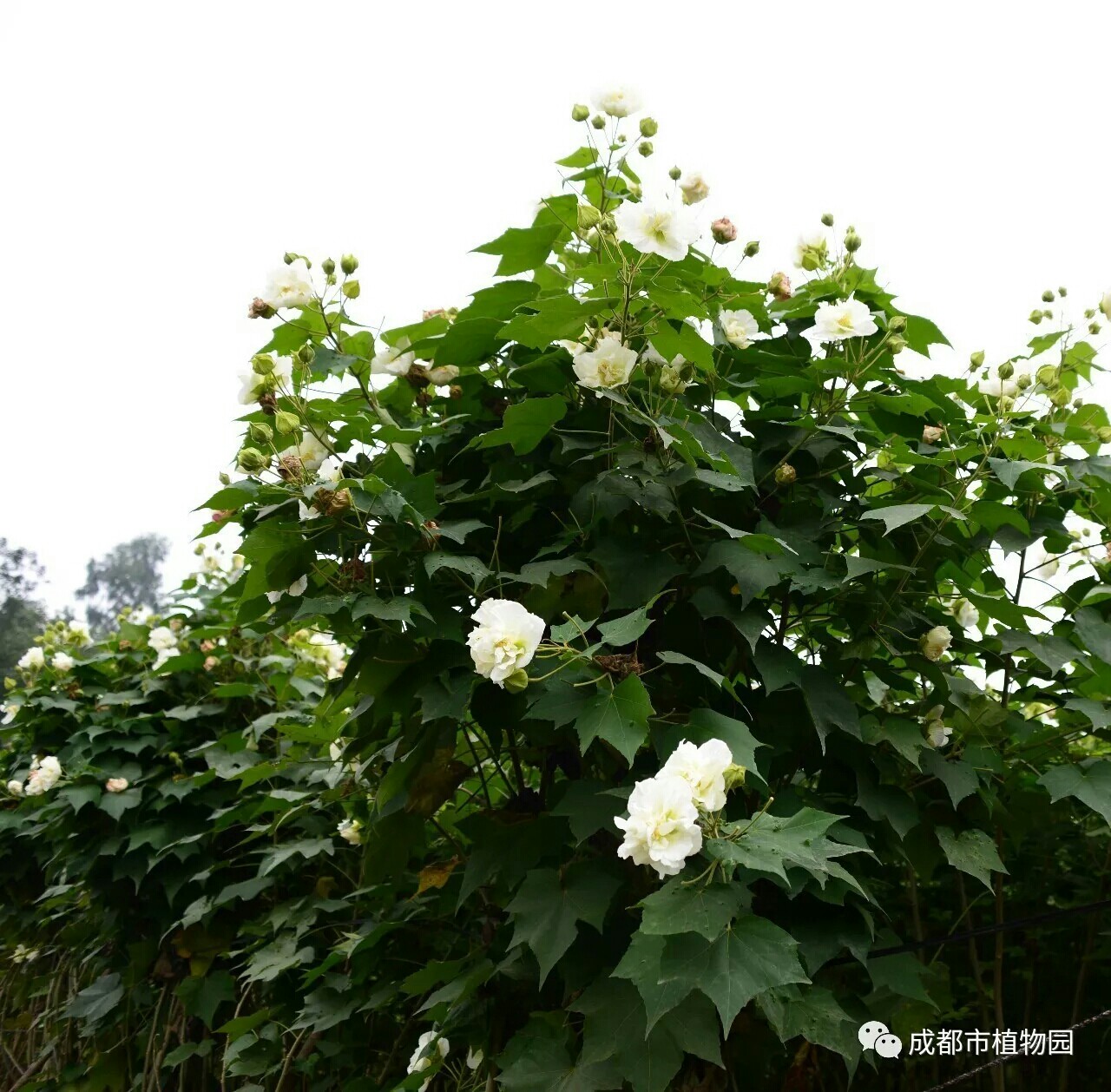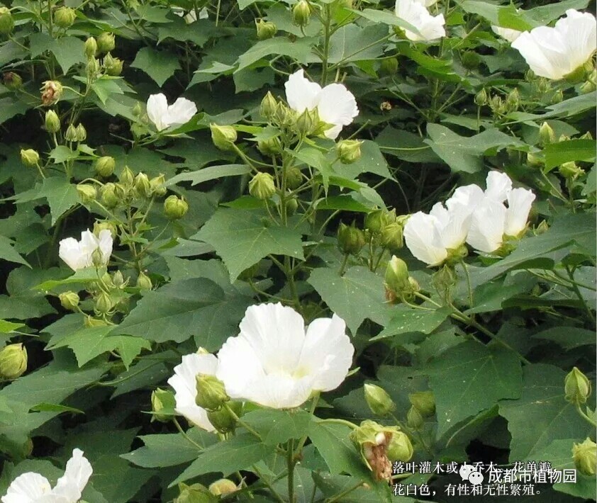 Hibiscus paramutabilis Bailey,落叶灌木至小乔木,叶5-7裂,有时3裂,花单生于枝端叶腋,花冠白色,内面基部带紫红色,蒴果长圆状卵圆形。花期7~8月开花,9~10月结果。