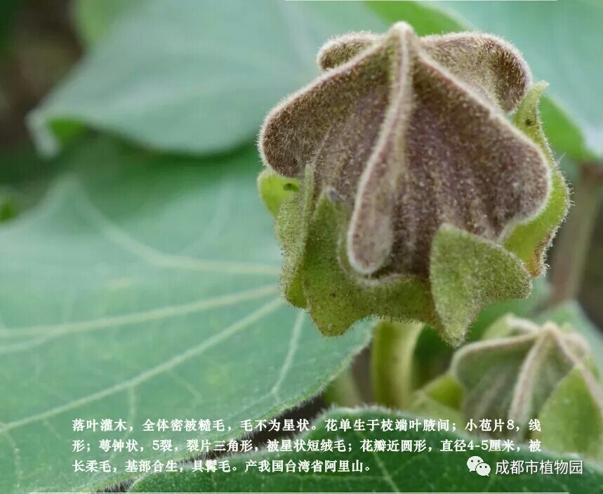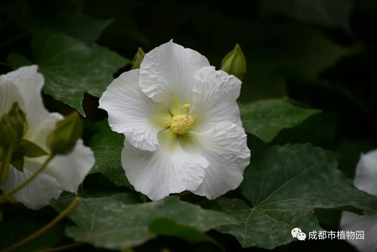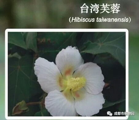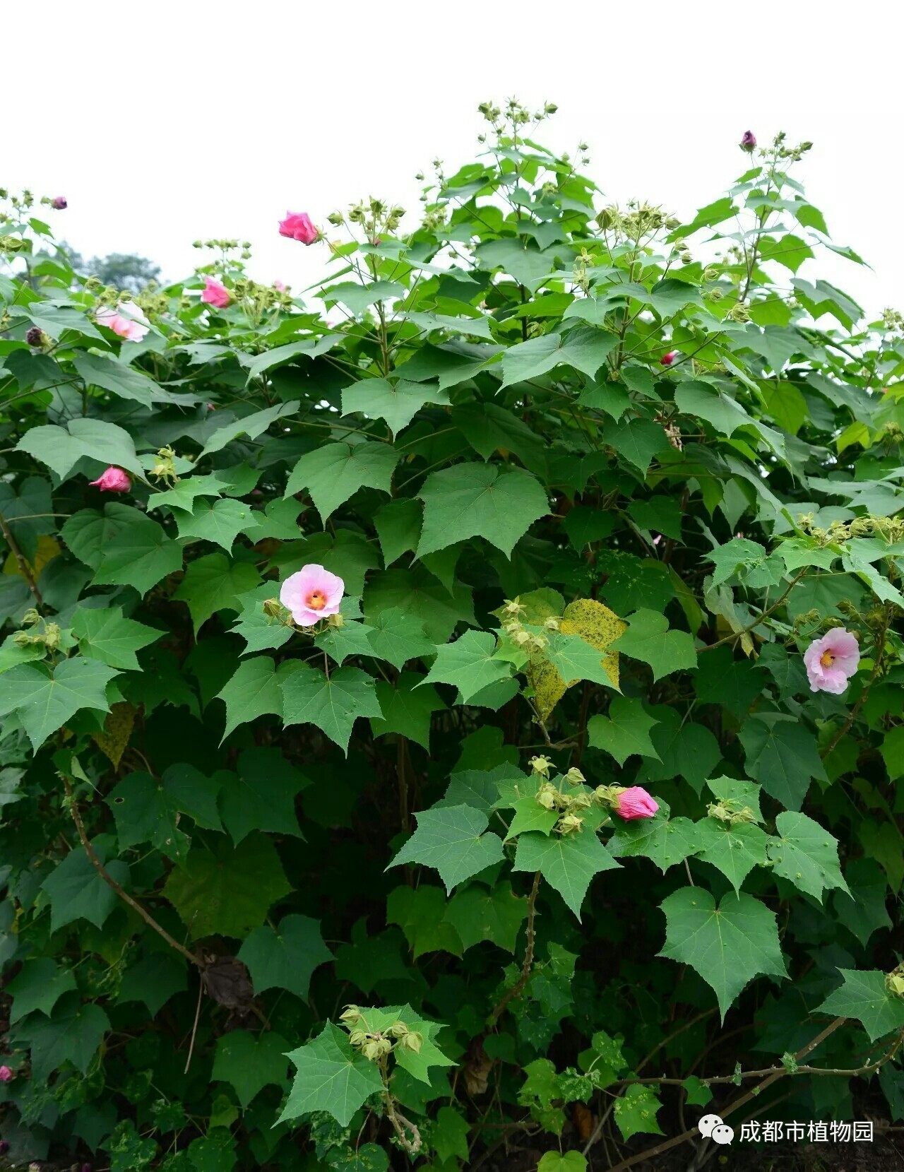 Hibiscus paramutabilis Bailey,落叶灌木至小乔木,叶5-7裂,有时3裂,花单生于枝端叶腋,花冠白色,内面基部带紫红色,蒴果长圆状卵圆形。花期7~8月开花,9~10月结果。