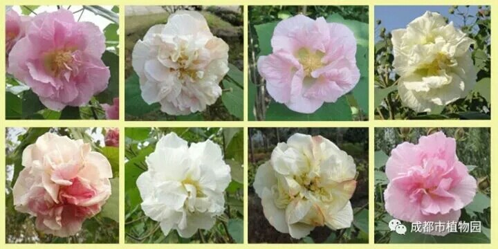 牡丹红、牡丹粉、玉蕊、成都紫、彩霞、百日华彩、单瓣白芙蓉、单瓣红芙蓉、庐山芙蓉、重瓣木芙蓉(变型)