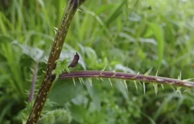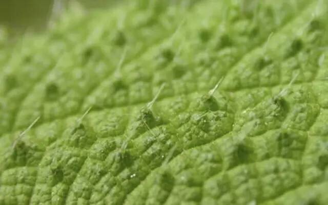 他的叶面、茎上都有刺,放大看,蝎子草这个刺毛尖锐异常、透明,他的内部填充有刺毛分泌的毒液,若是皮肤接触,免不了刺痛。