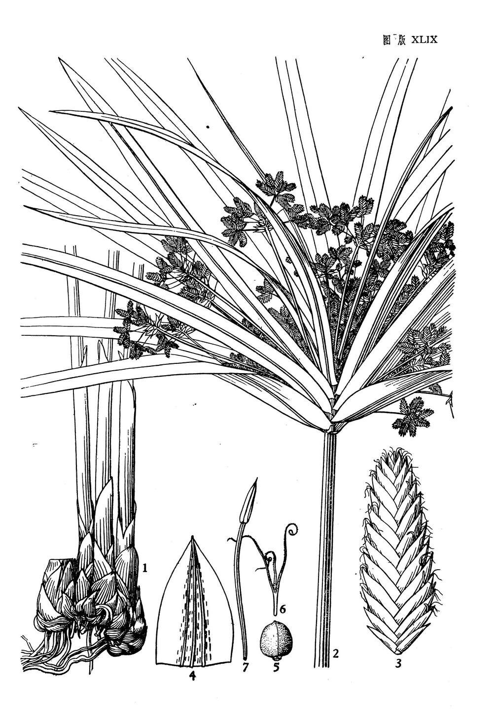 根状茎短,粗大,须根坚硬。秆稍粗壮,高30-150厘米,近圆柱状,上部稍粗糙,基部包裹以无叶的鞘,鞘棕色。苞片20枚,长几相等,较花序长约2倍,宽2-11毫米,向四周展开,平展;多次复出长侧枝聚繖花序具多数第一次辐射枝,辐射枝最长达7厘米,每个第一次辐射枝具4-10个第二次辐射枝,最长达15厘米;小穗密集于第二次辐射枝上端,椭圆形或长圆状披针形,长3-8毫米,宽1.5-3毫米,压扁,具6-26朵花;小穗轴不具翅;鳞片紧密的复瓦状排列,膜质,卵形,顶端渐尖,长约2毫米,苍白色,具锈色斑点,或为黄褐色,具3-5条脉;雄蕊3,花药线形,顶端具刚毛状附属物;花柱短,柱头3。小坚果椭圆形,近于三稜形,长为鳞片的1/3,褐色。 我国南北各省均见栽培,作为观赏植物;原产于非洲,广泛分布于森林、草原地区的大湖、河流边缘的沼泽中。