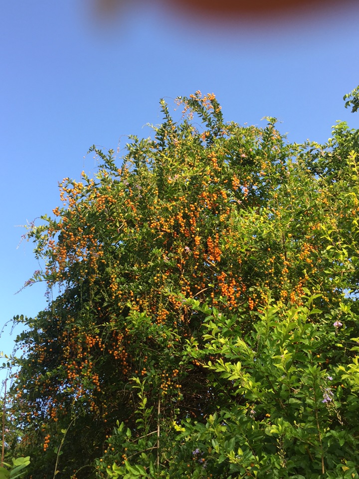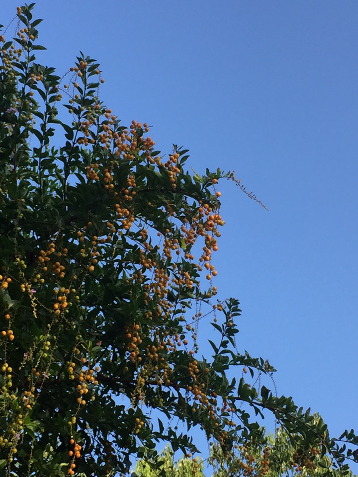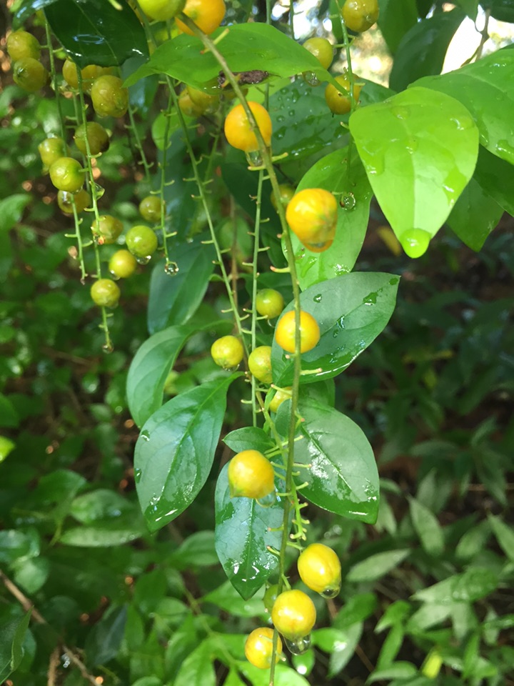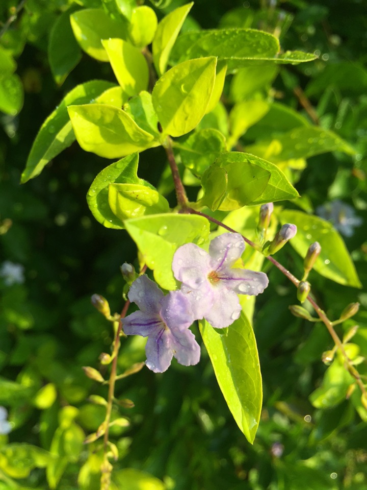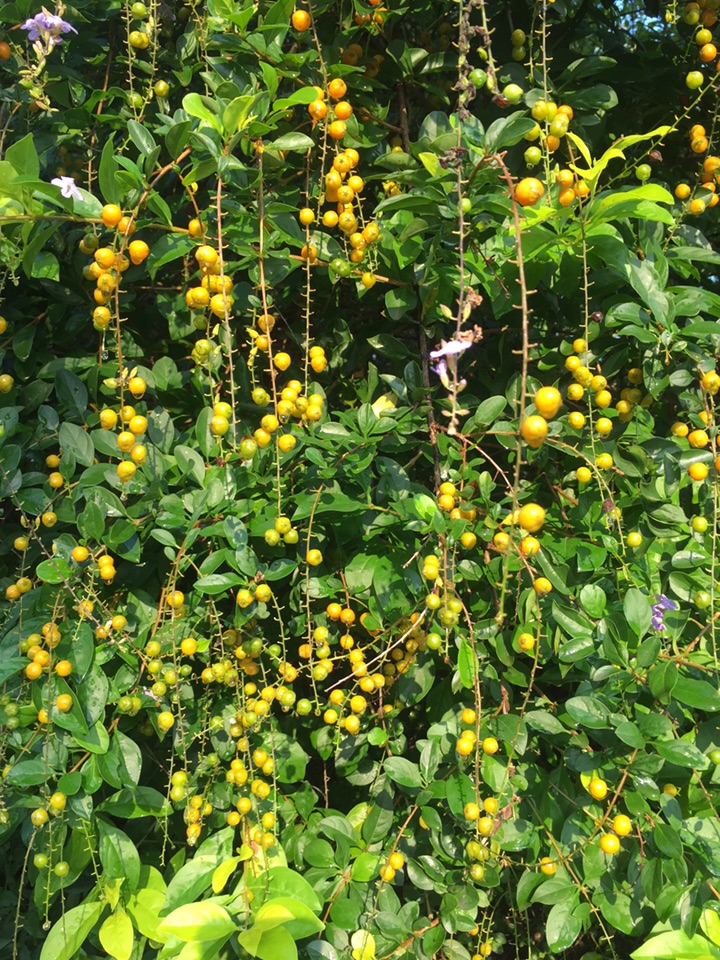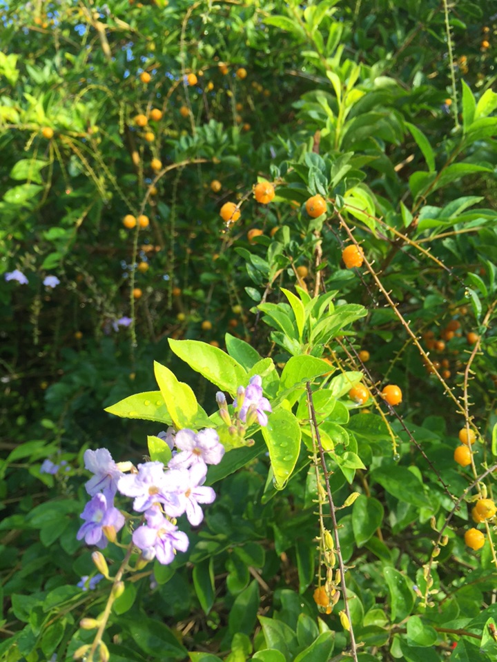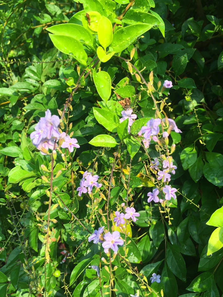 或许是因为对紫色的偏爱,很早就留意到了假连翘的花儿:五个小小的花瓣,淡淡的紫色,静静地垂着,像一个个小小的酒窝,特别惹人怜惜。