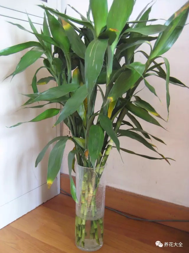2.已经生根的富贵竹,叶子发黄则是平时的养护不到位,将富贵竹放在客厅这种光线明亮的地方,然后用静置了1~2天的自来水给富贵竹添水,水不要太满,基本上1/2或者2/3就足够了!