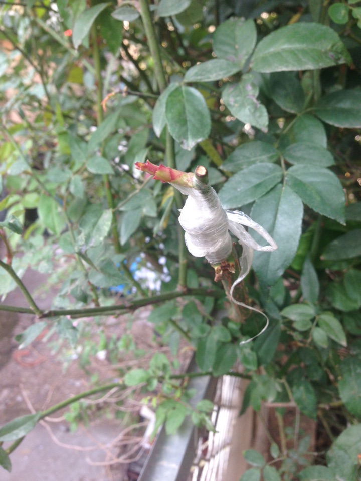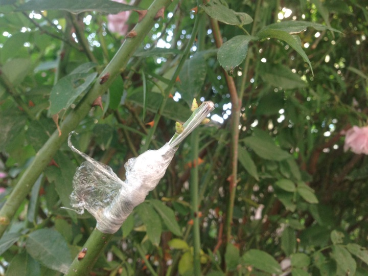 我用的是切接法,没有专业的嫁接带,保鲜膜包扎的有点丑…,图片是嫁接后两三星期拍的,芽点已经冒出来了,说明已经嫁接成功😘😘