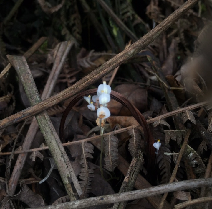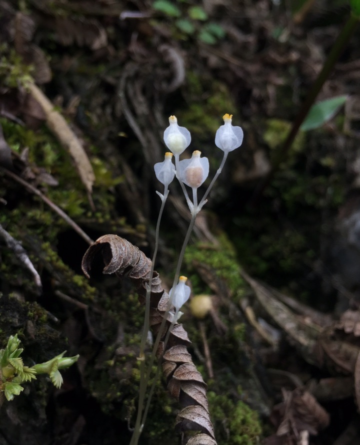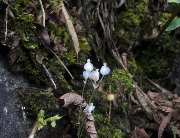 树丛下,石头缝隙间发现的腐生植物,全株无叶绿素,几近透明。问了山里人,大人们都不认识,一个小男孩倒是很熟悉但也说不出它的名字。