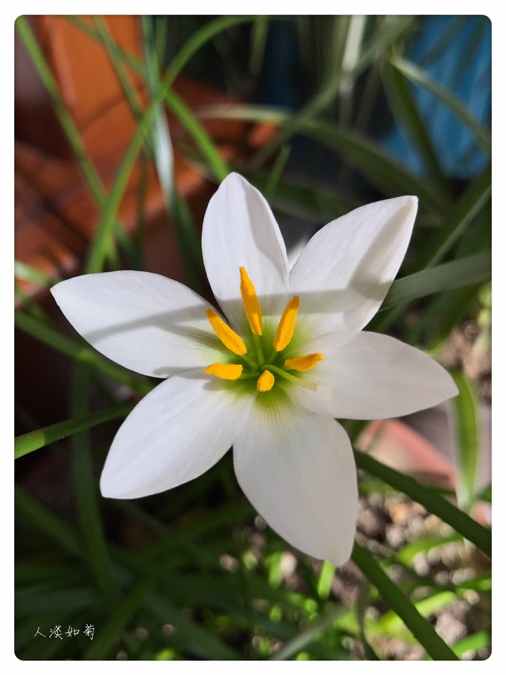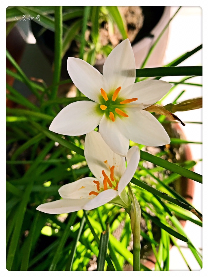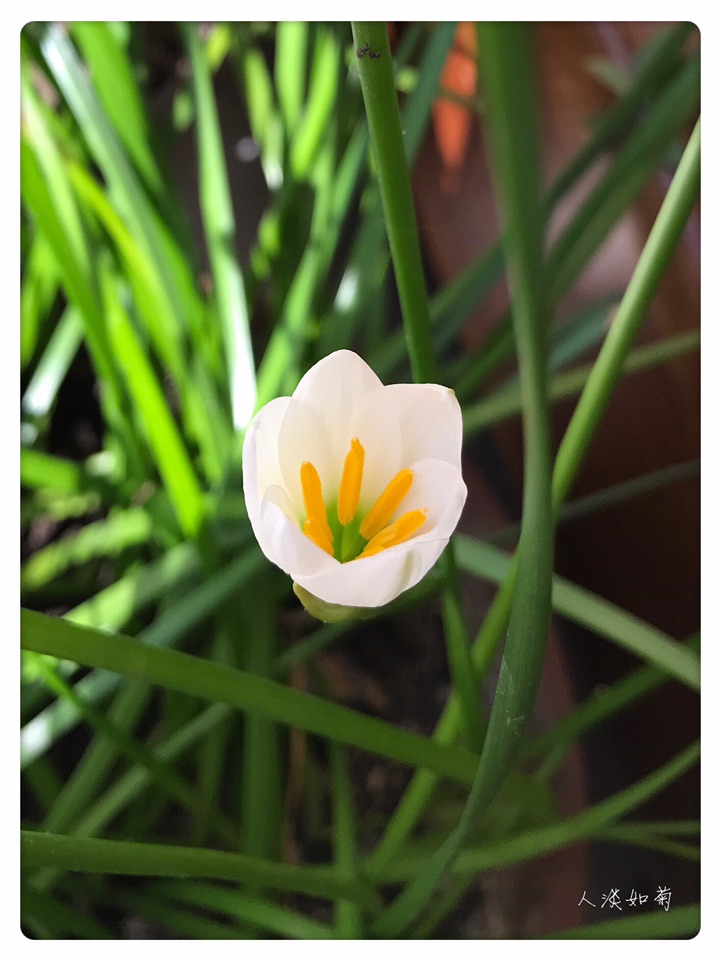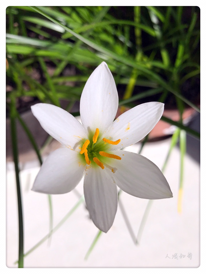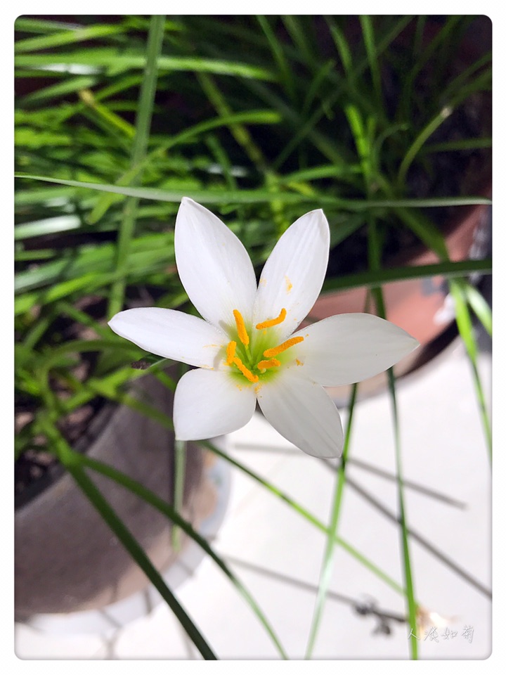 在韭莲开过很久以后的今天终于等到了葱莲的绽放,沐浴在阳光里洁白的花安静而雅致。