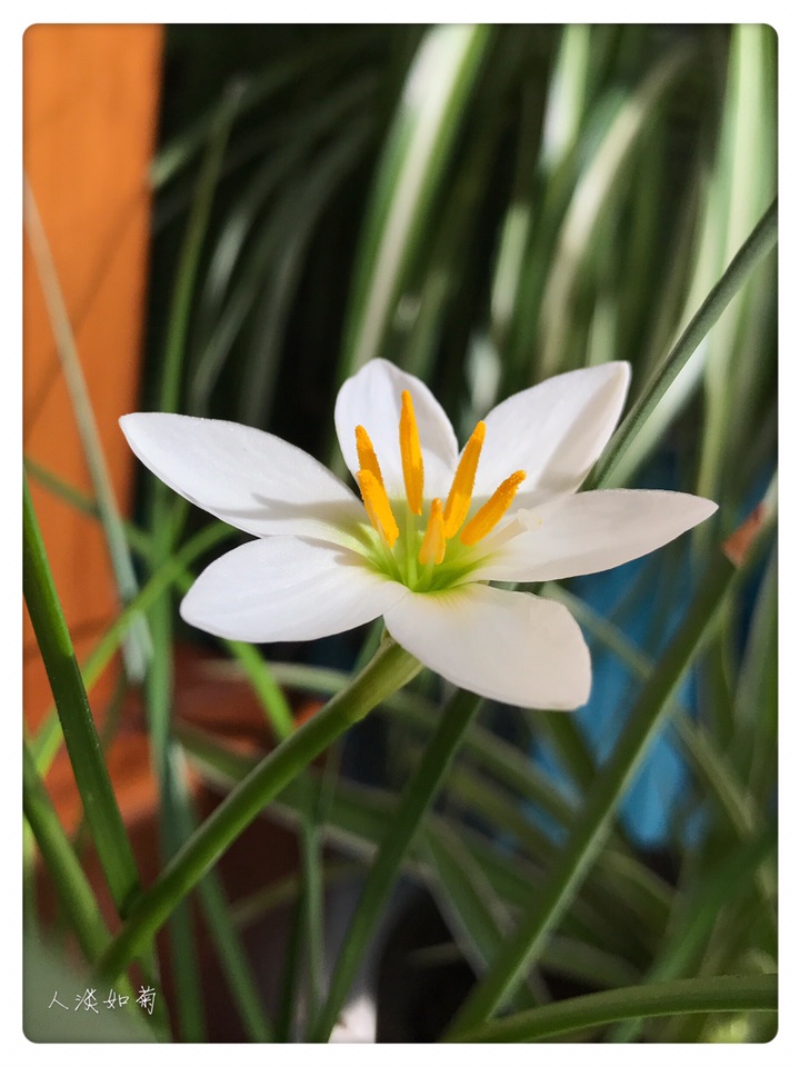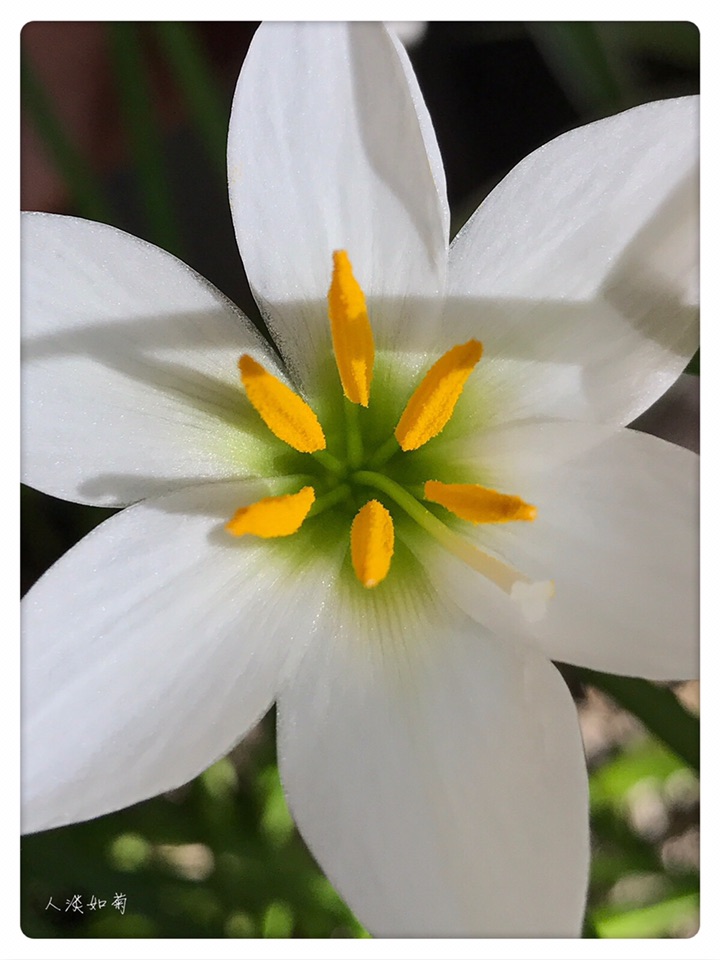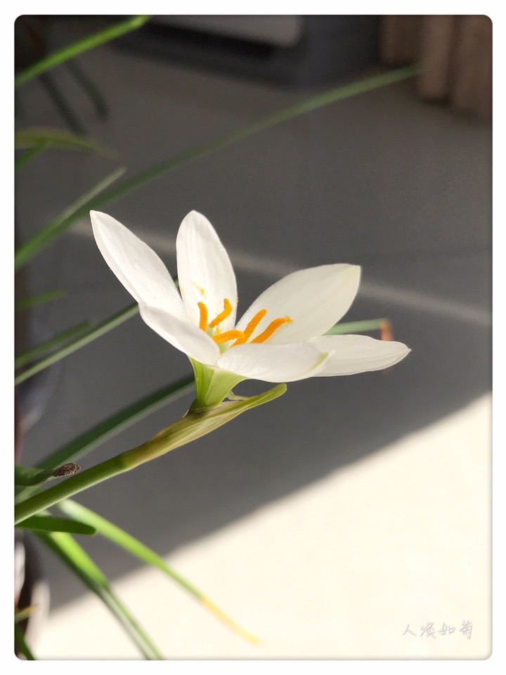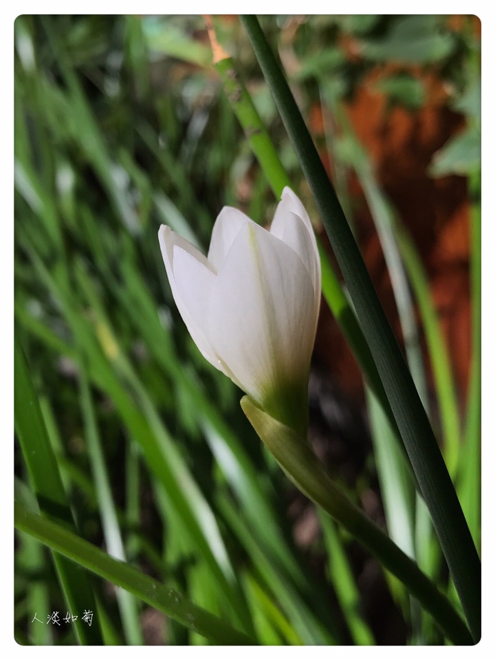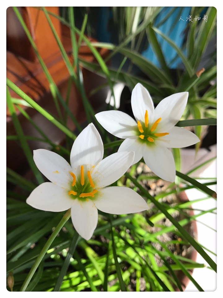 在韭莲开过很久以后的今天终于等到了葱莲的绽放,沐浴在阳光里洁白的花安静而雅致。