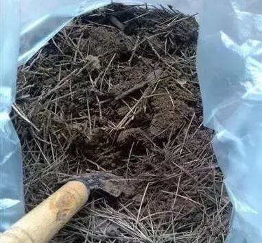 2.把松针和原土混合,放在塑料袋和桶里,浇水,保持湿润。