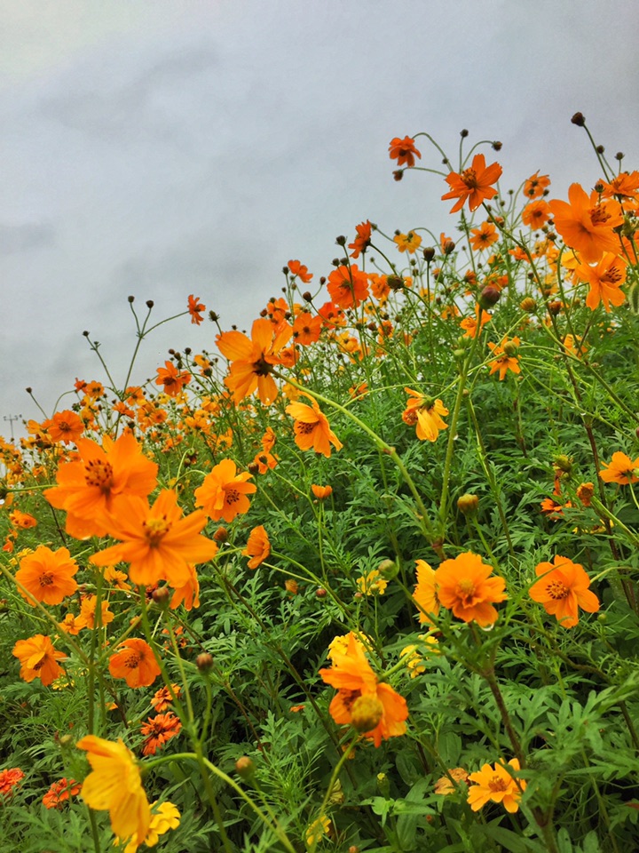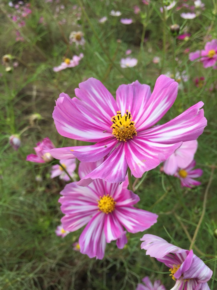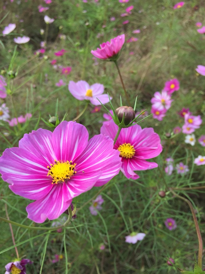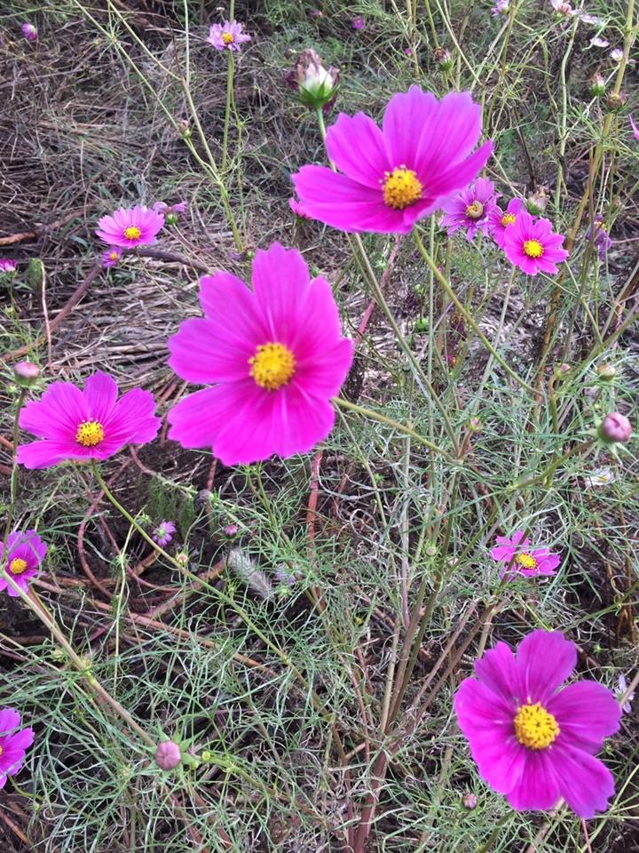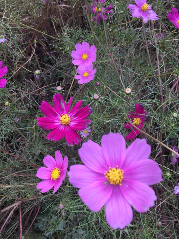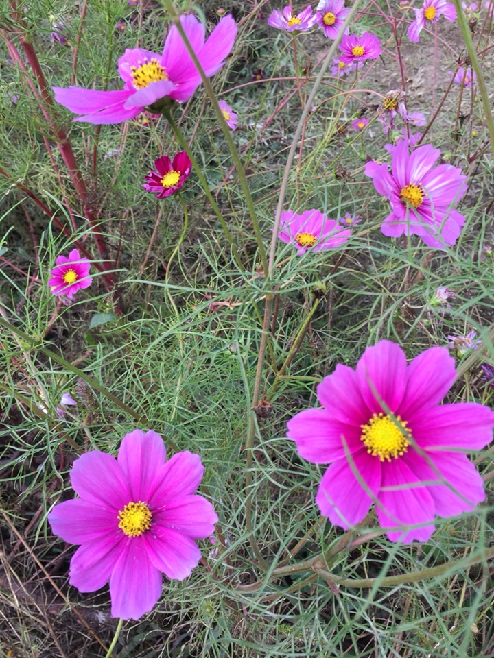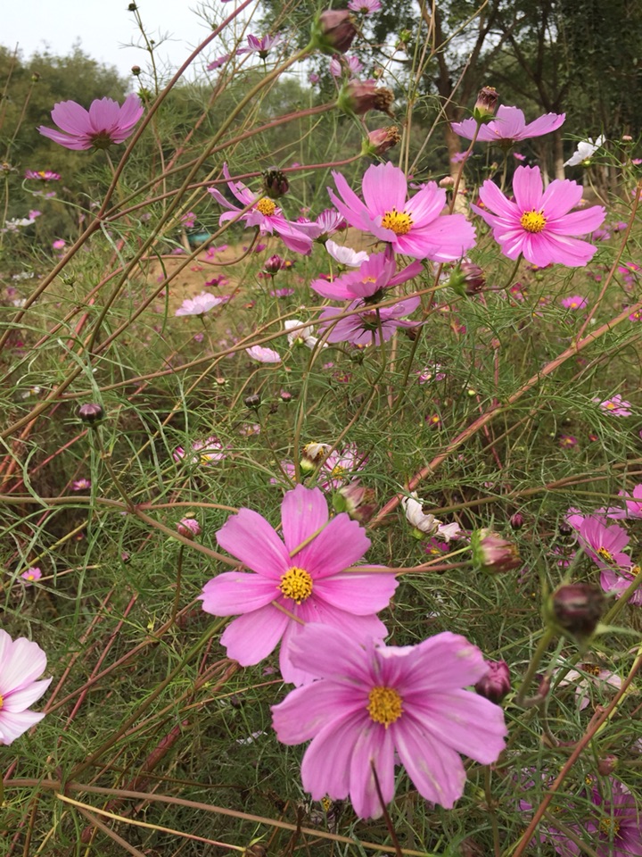 春天,朋友给了一些波斯菊种子,种下去,期盼中发芽生长。幻想着开放的样子。但是,就怕但是这个词,因为忙了一阵子,等我再去看时,长满了细细的蛛网,半尺高的花苗蔫蔫的。不知道怎么处理,又怕影响到别的花草,忍痛丢弃了 。只能去公园里看看这美丽的花。心痛!!