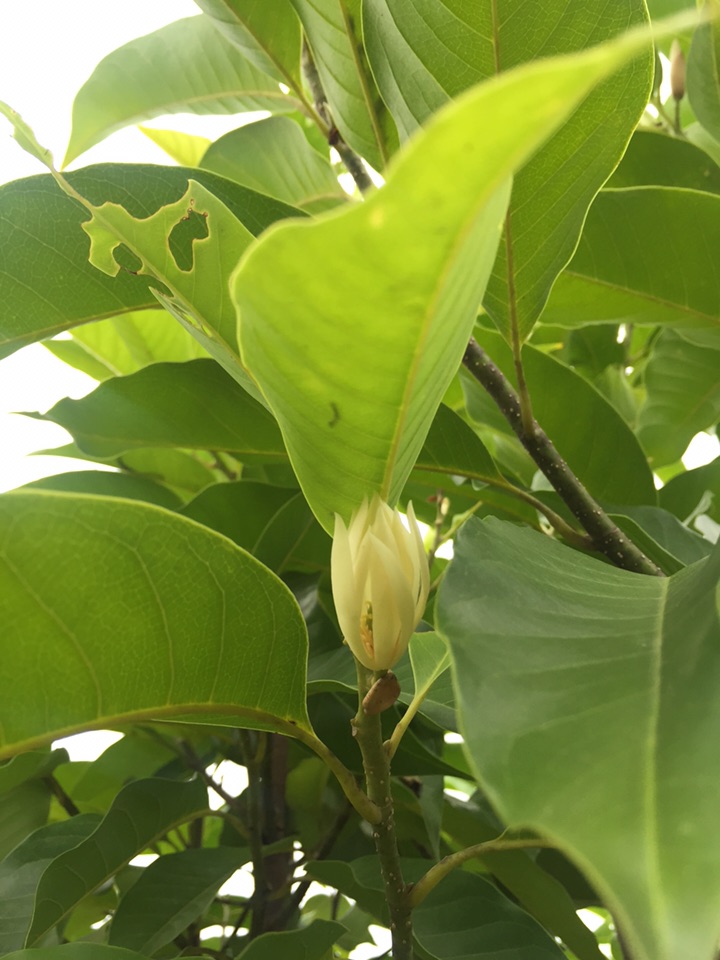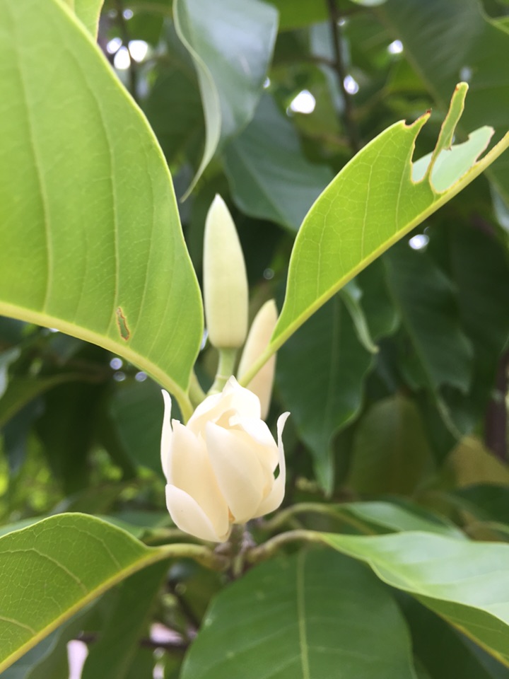 第一次闻到它的花香,是在一个夏日的傍晚吧。那天应该是值班打扫卫生经过它的旁边,突然就闻到一种清幽的香气,让人非常舒服。举目寻找,终于在密密匝匝的大叶子中间,找到了它的花儿:小巧精致,洁白如玉⋯我控制住自己想摘的冲动,只是用力地吸吸气。