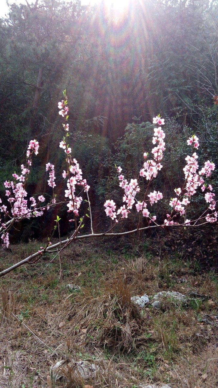山,遇到一片盛开的桃花,背映青山,迎着阳光,看上去格外俏丽。