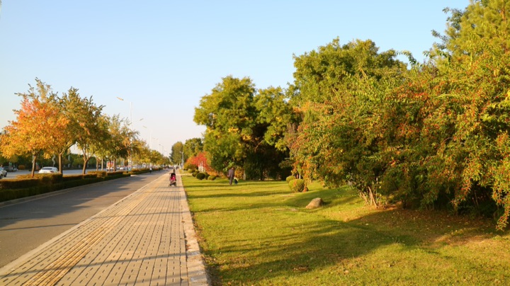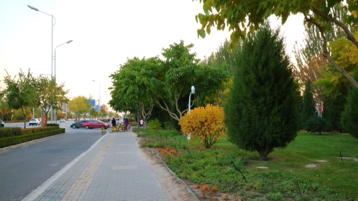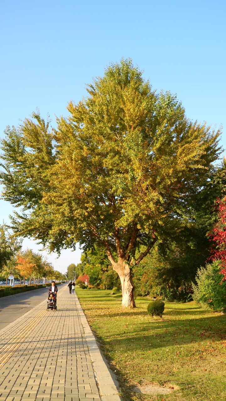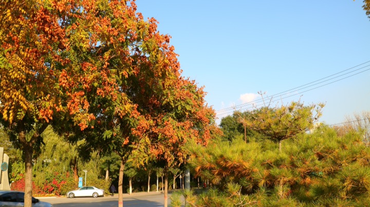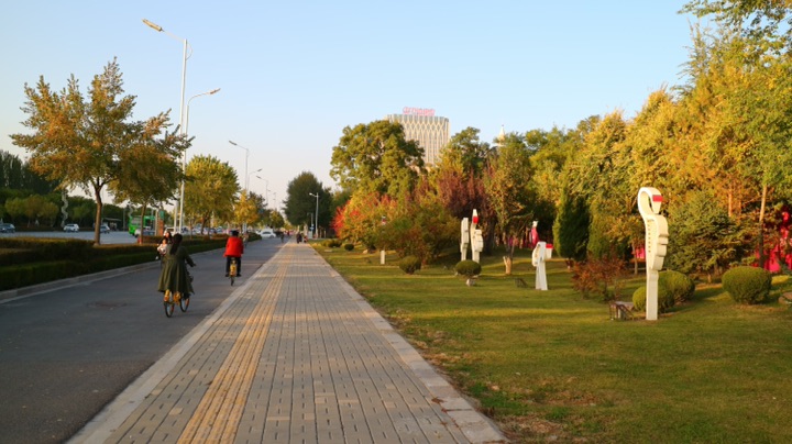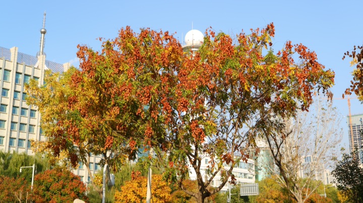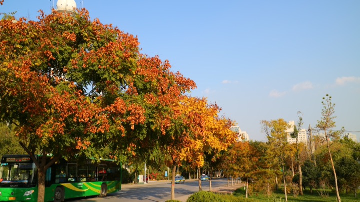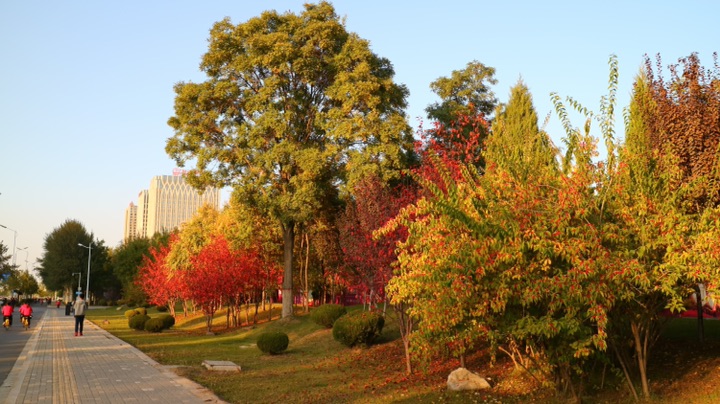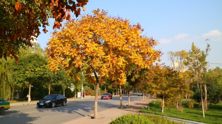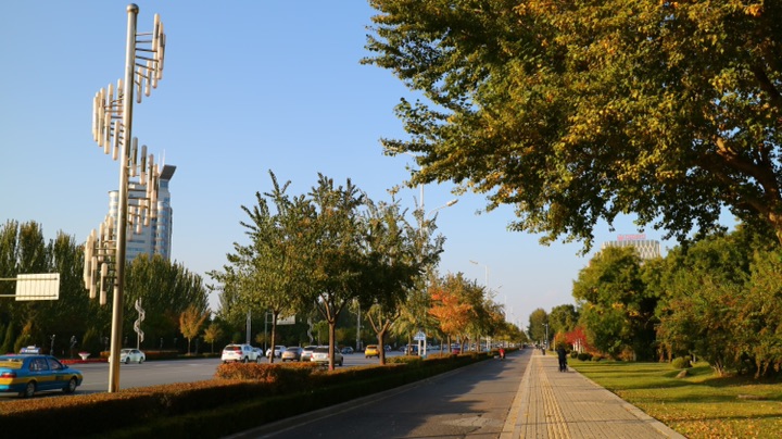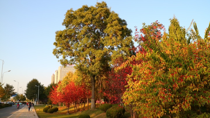 秋日的银川,街道两旁色彩斑斓的树木在风中摇曳,美不胜收。
