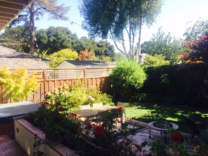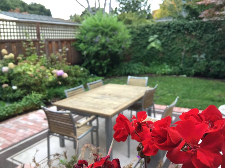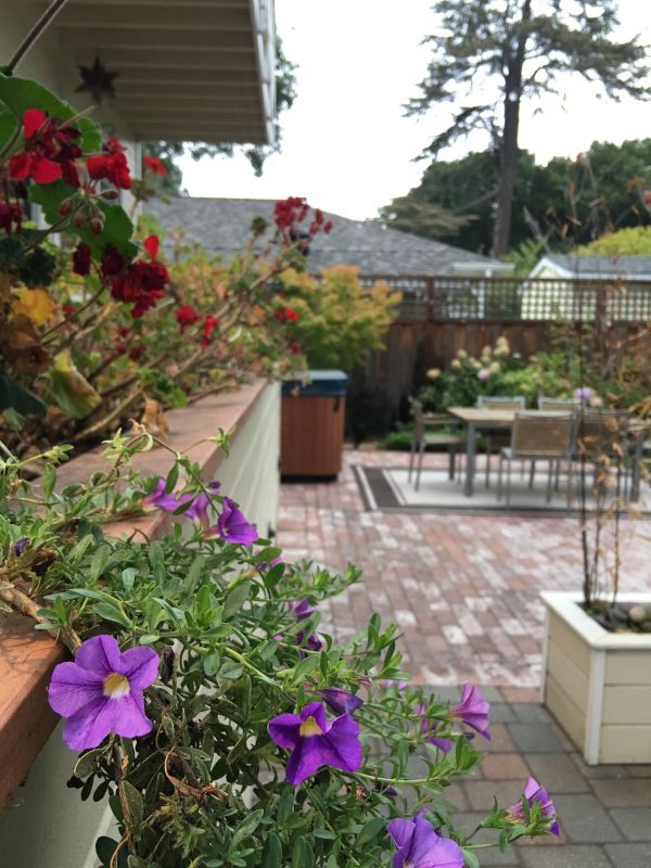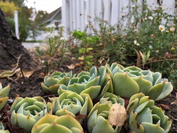 后院的植物更多,中国红的是天竺葵 下面紫色的是碧冬茄,整个围墙上爬满的应该是爬山虎吧, 上面还穿插了一支无花果 ,旁边还有开花的假连翘,露天餐桌旁边种了一打簇绣球花,各色的,当时中国天气冷已经谢了,旧金山还开的正旺。 偷偷去房子侧面看了一眼,也是各种植物,这个多肉叫什么?长得特别好,当时很想动手现场来一个叶插种植。